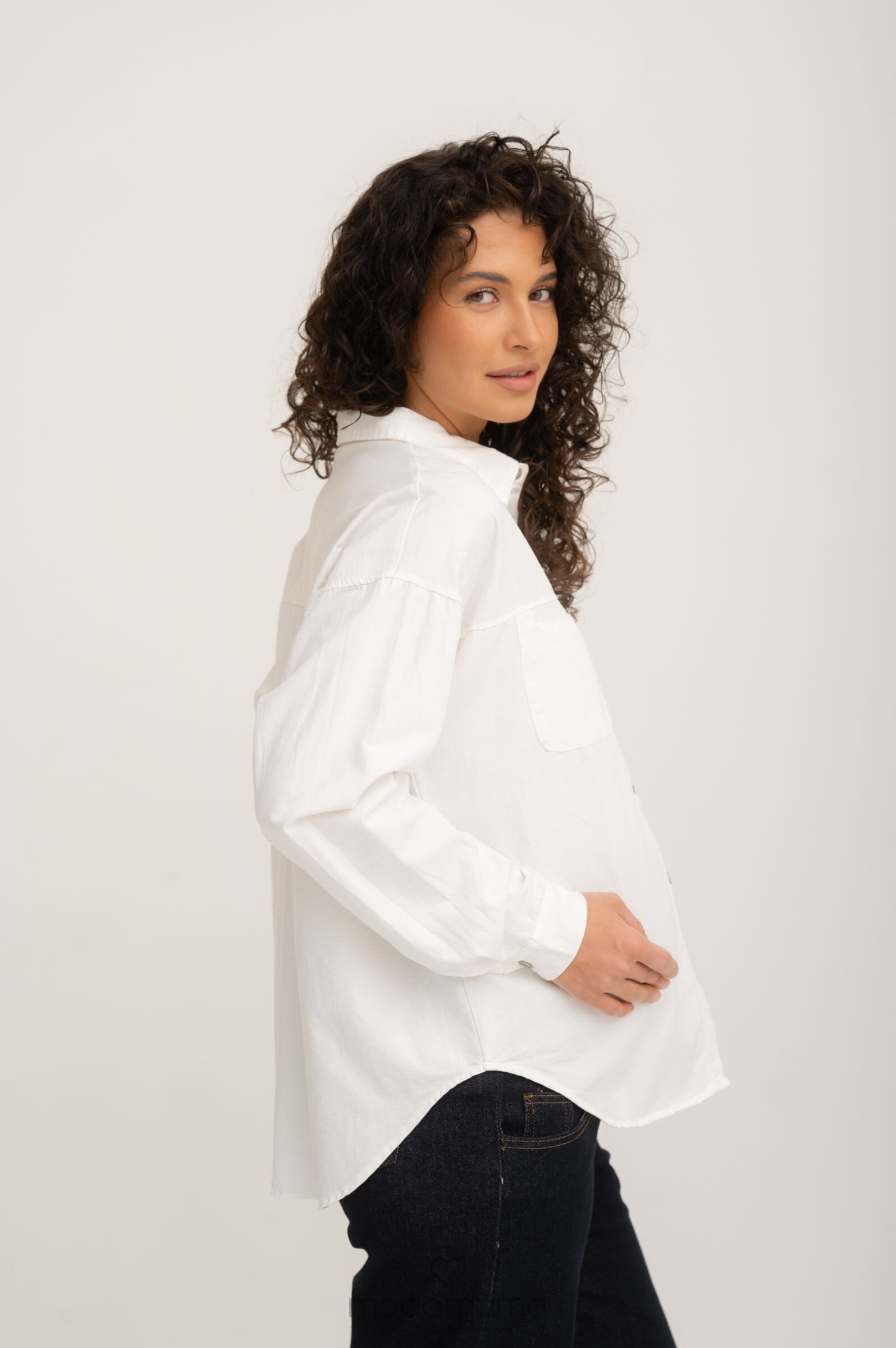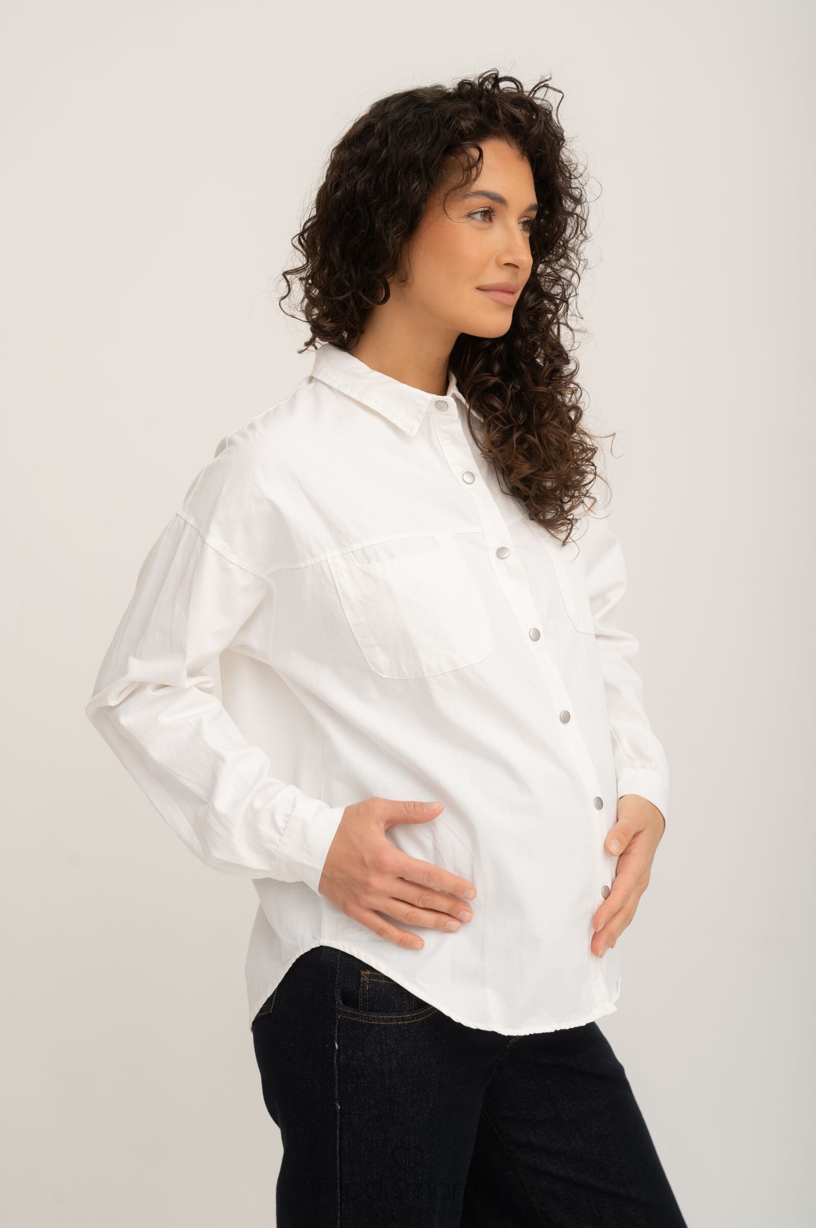 Рубашка на кнопках свободного универсального силуэта в стиле оверсайз со спущенным плечом и акцентными карманами. Выполнена из мягкго хлопка средней плотности с джинсовым переплетением.