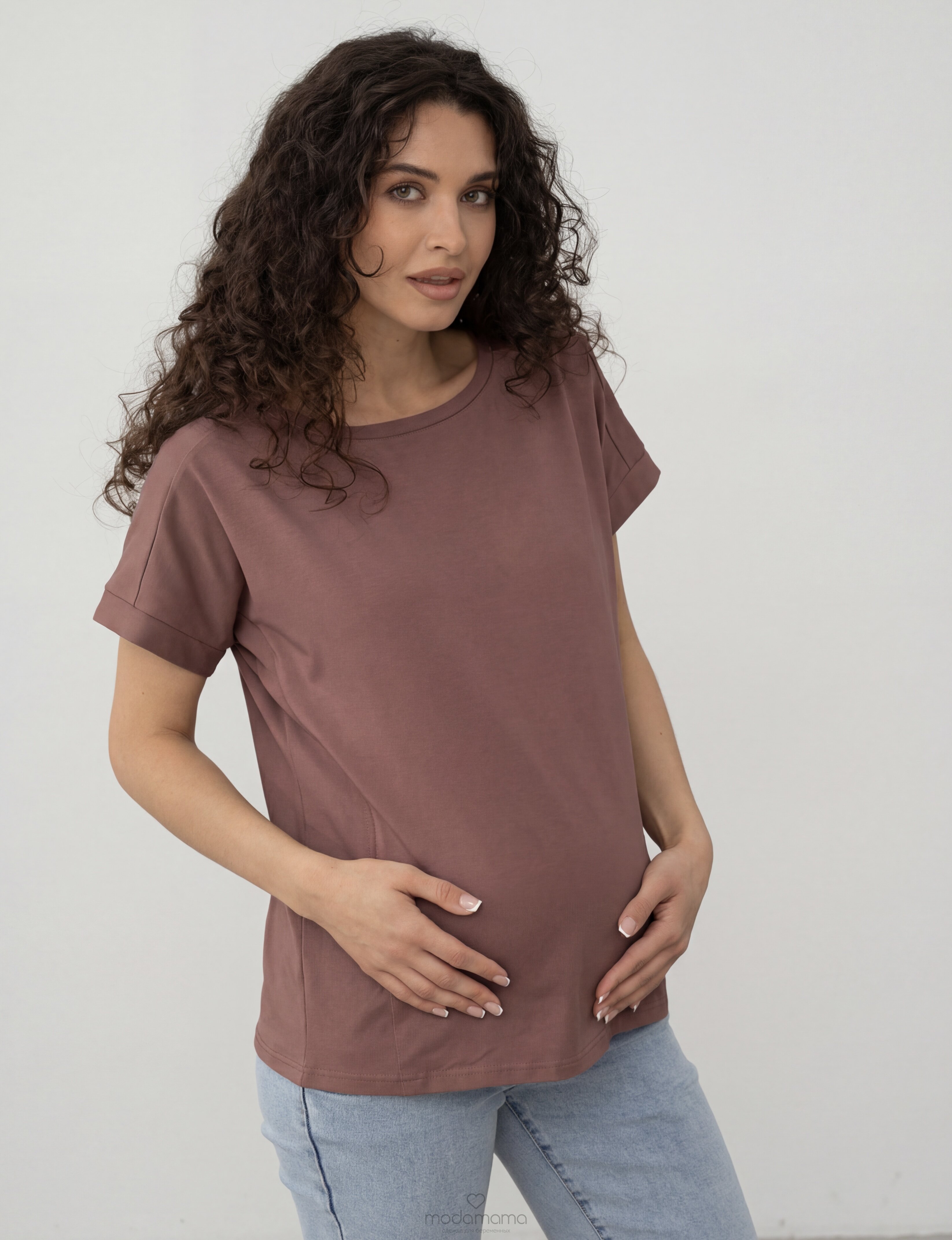 Футболка для беременных и кормящих мам свободного кроя с коротким цельнокроенным рукавом со спущенным плечом. Выполнена из тонкого трикотажа с добавлением эластана. Секрет для кормления - вертикальные замки-"молнии" в рельефах на груди.