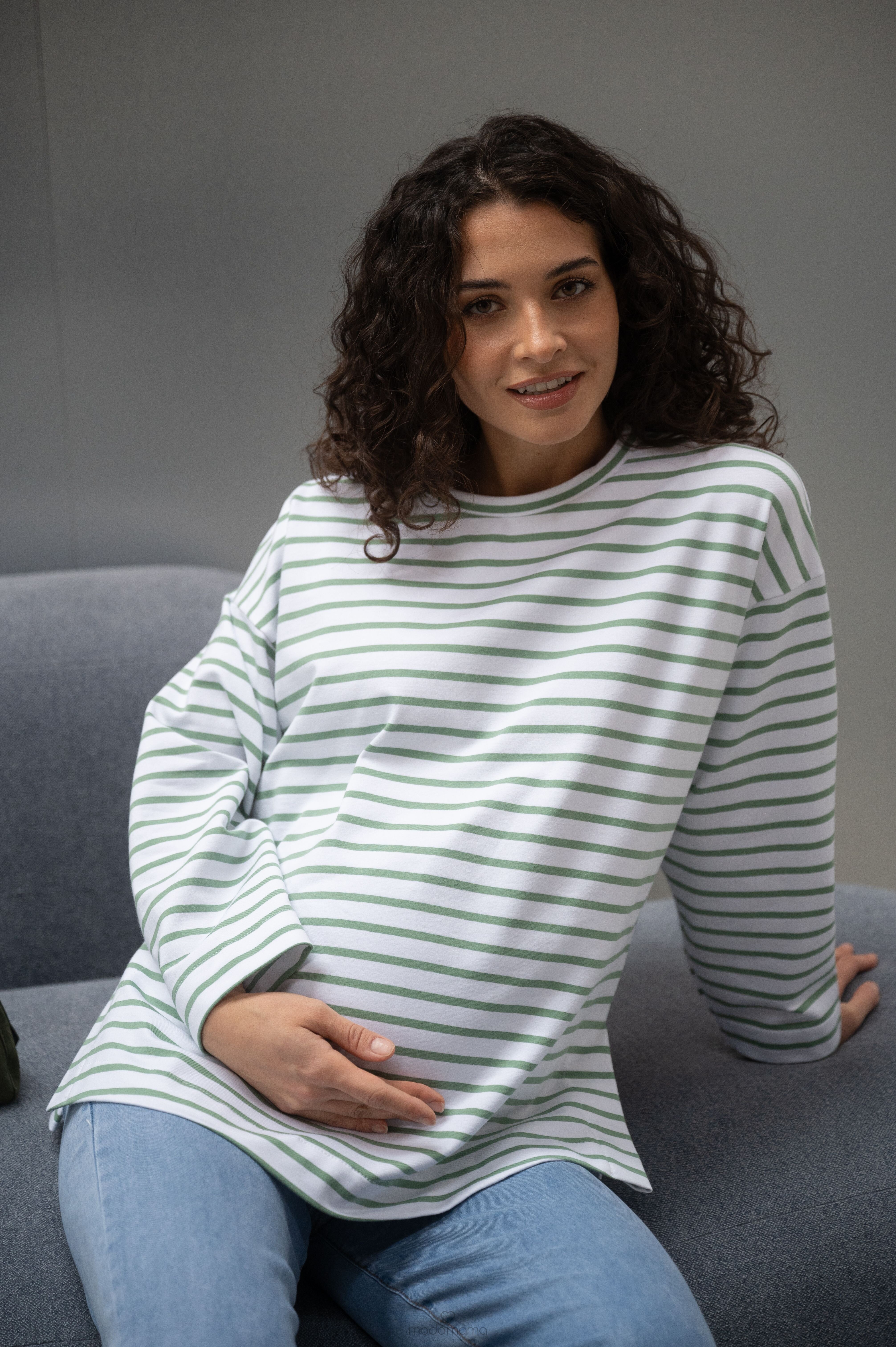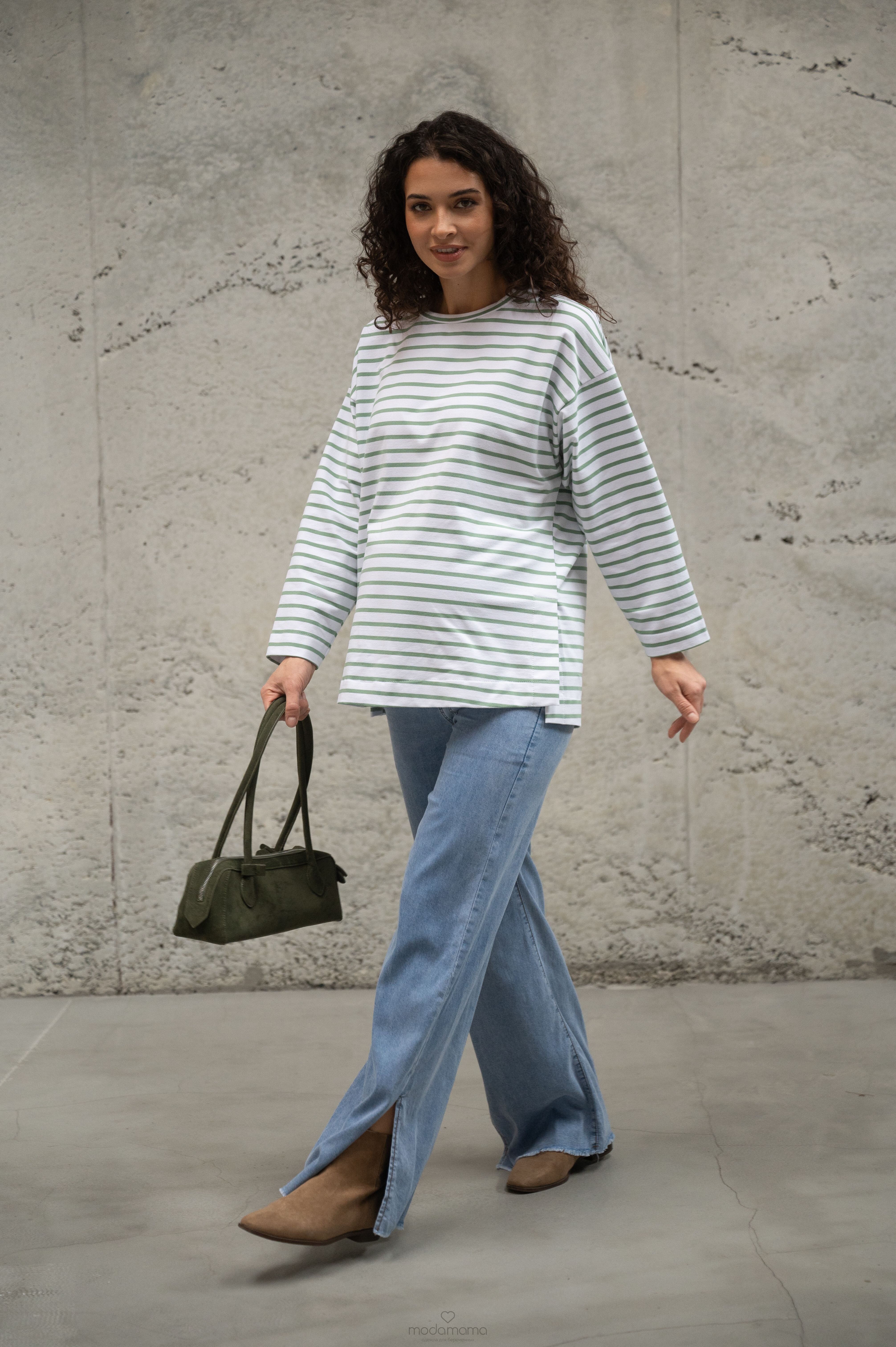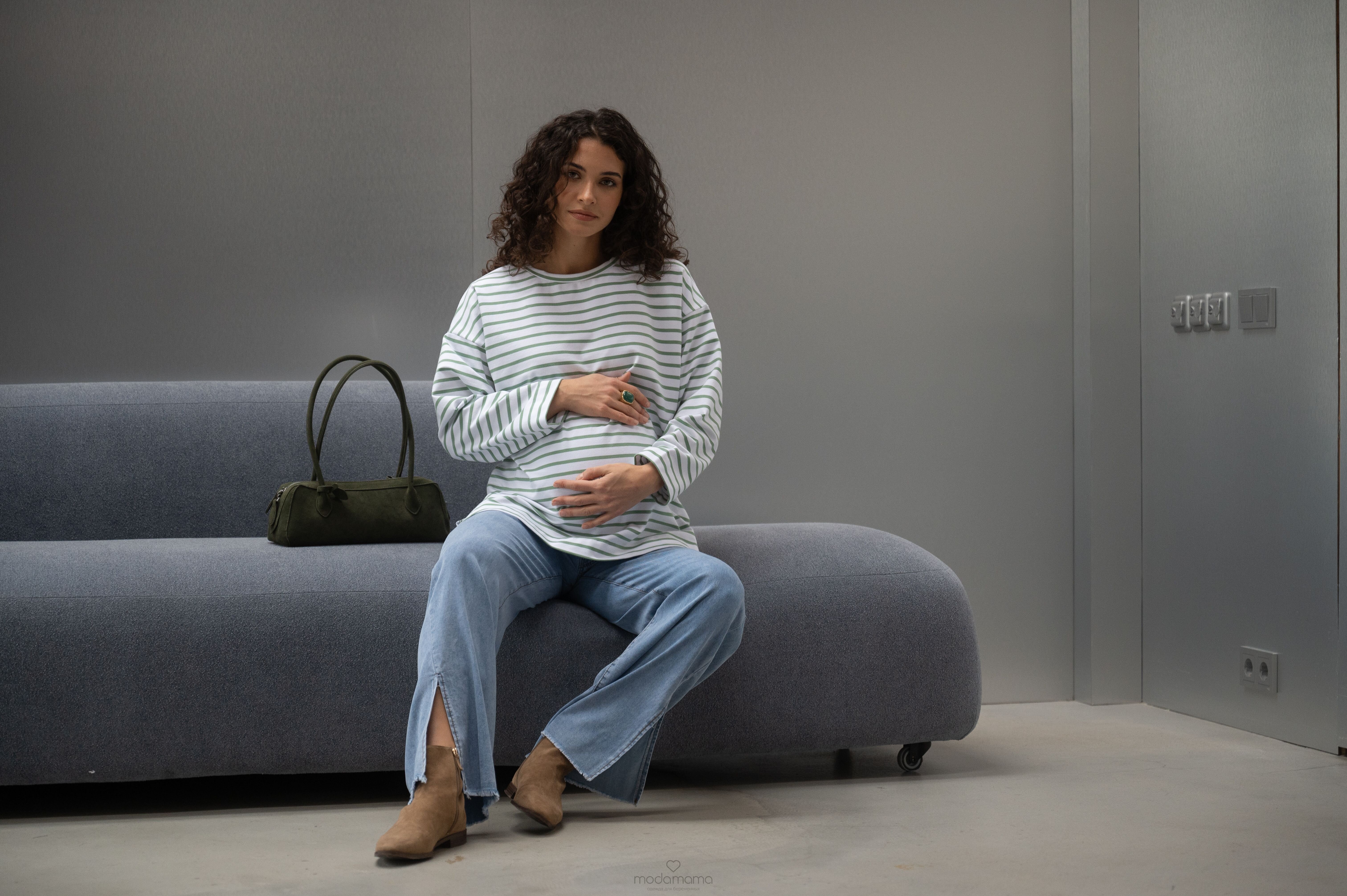 Джемпер для беременных универсального свободного кроя с разрезами по бокам и спущенным плечом в стиле оверсайз. Выполнен из мягкого хлопкового трикотажа футер-двухнитка.