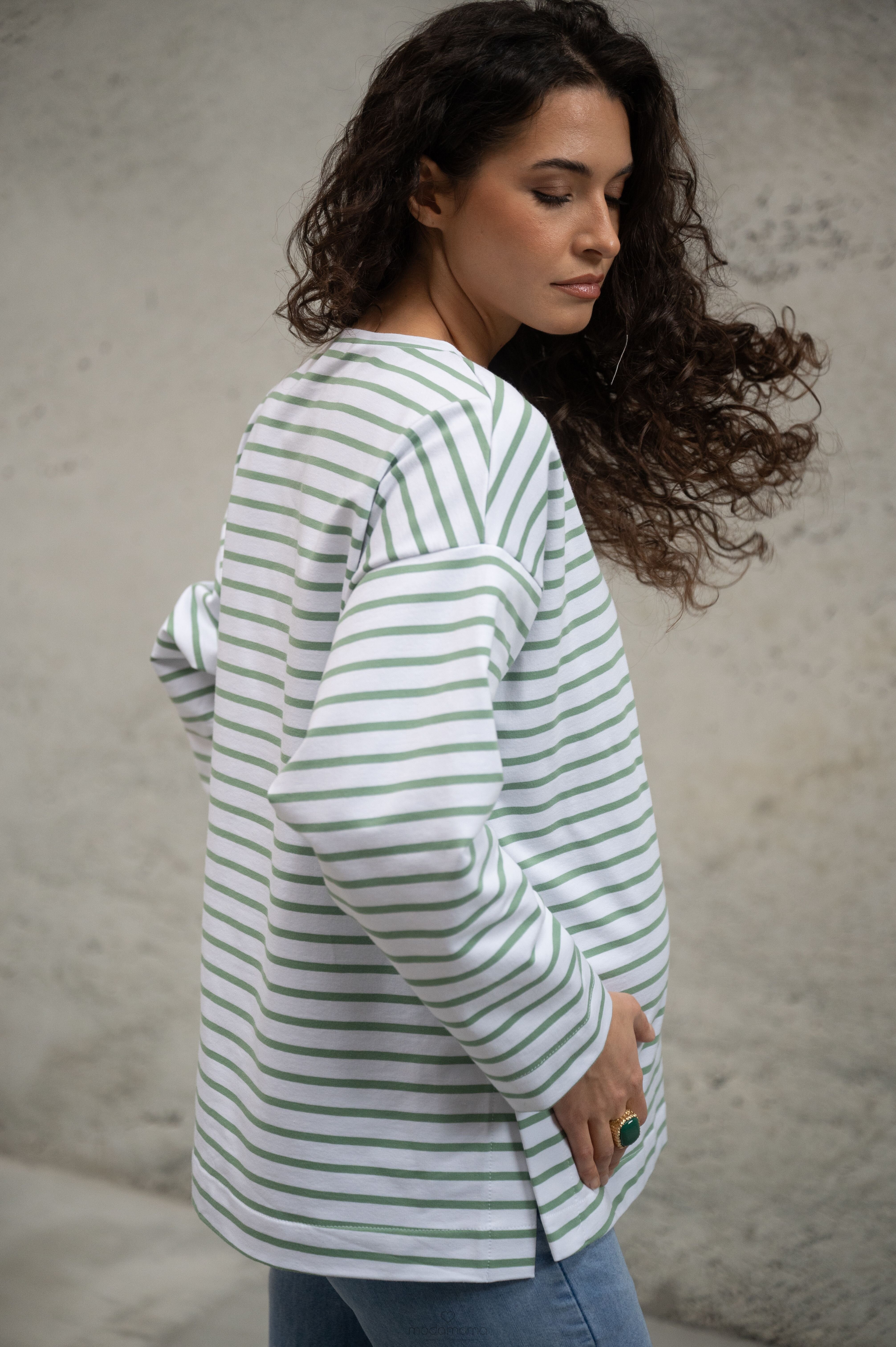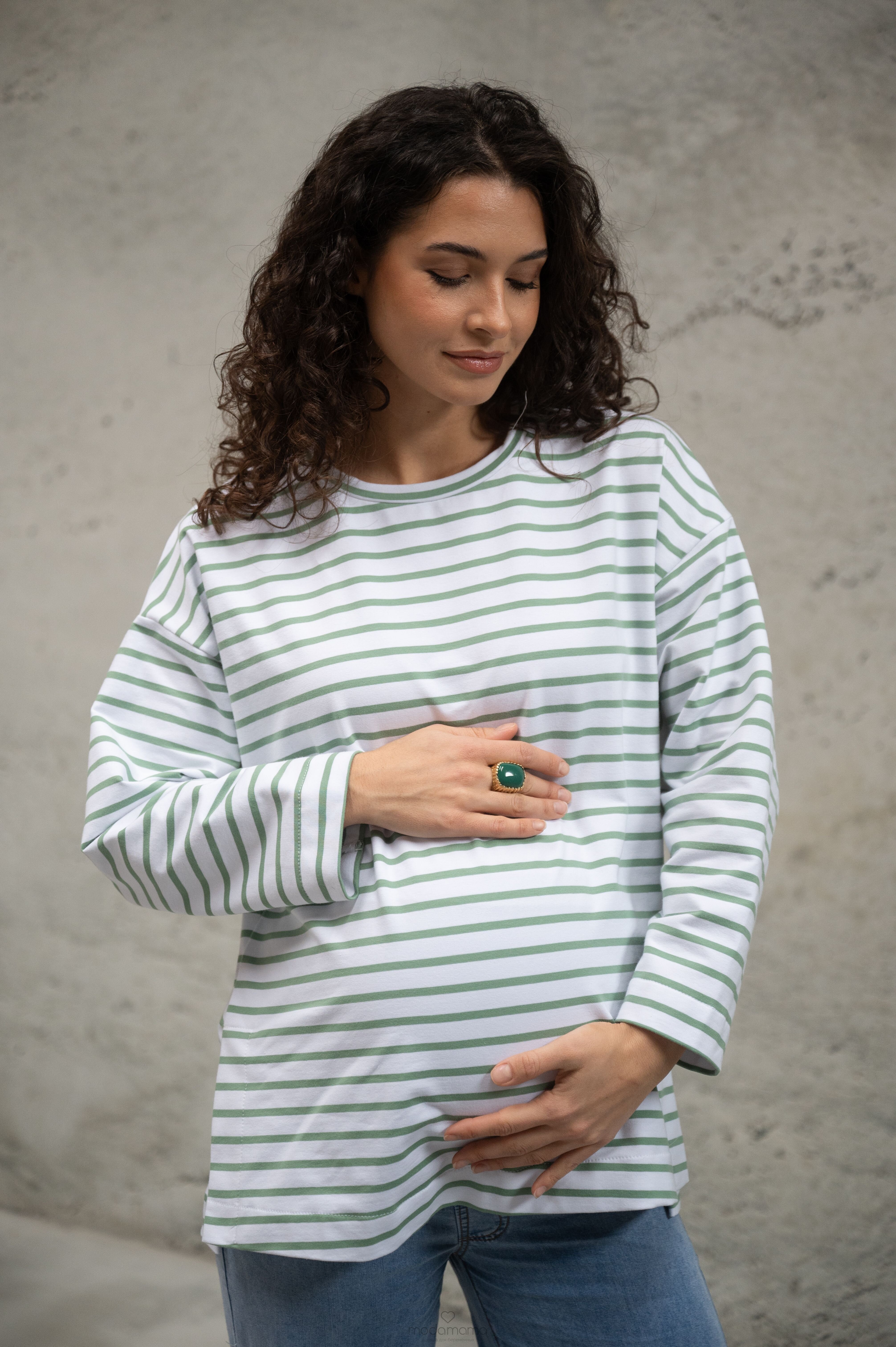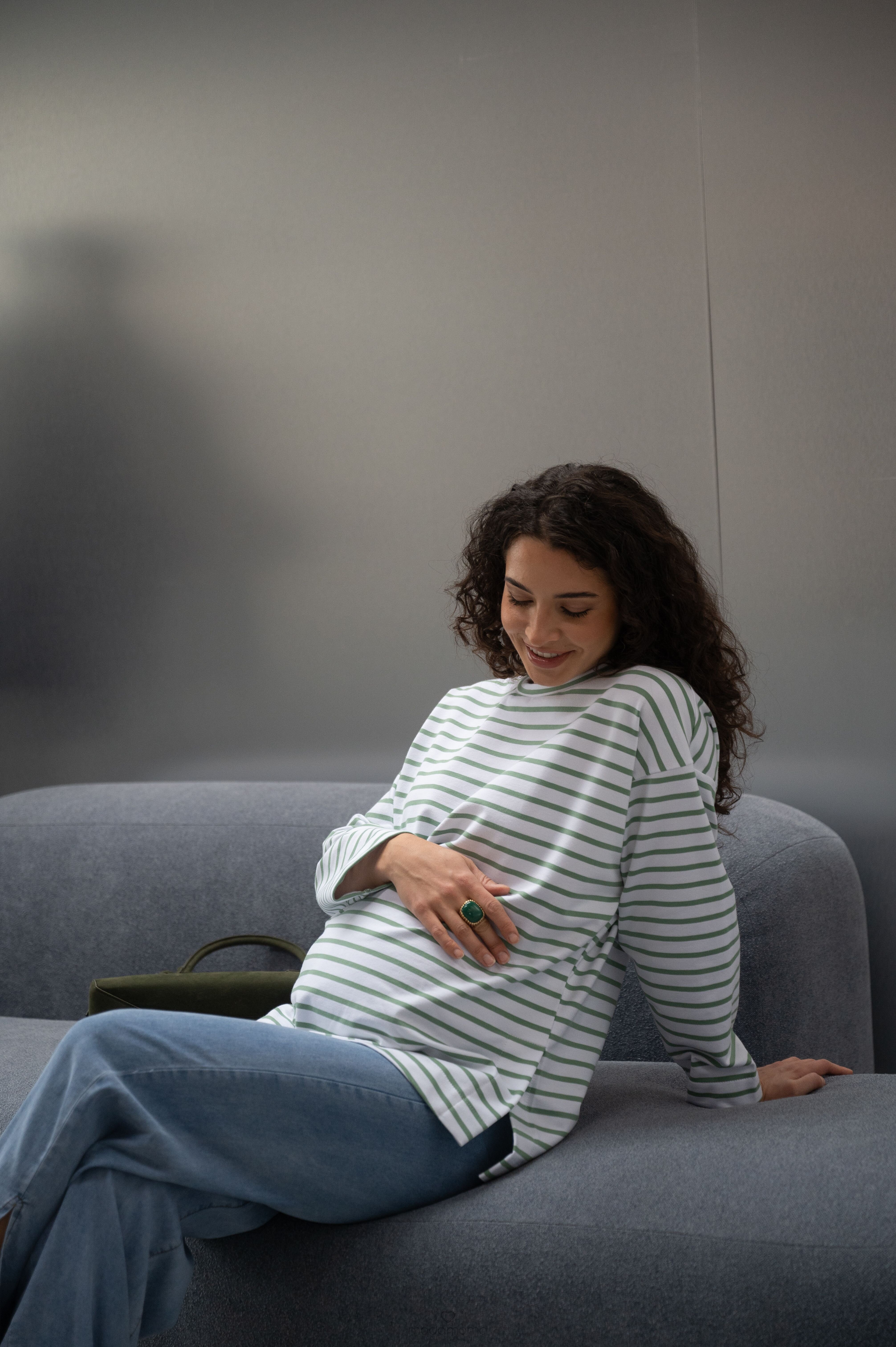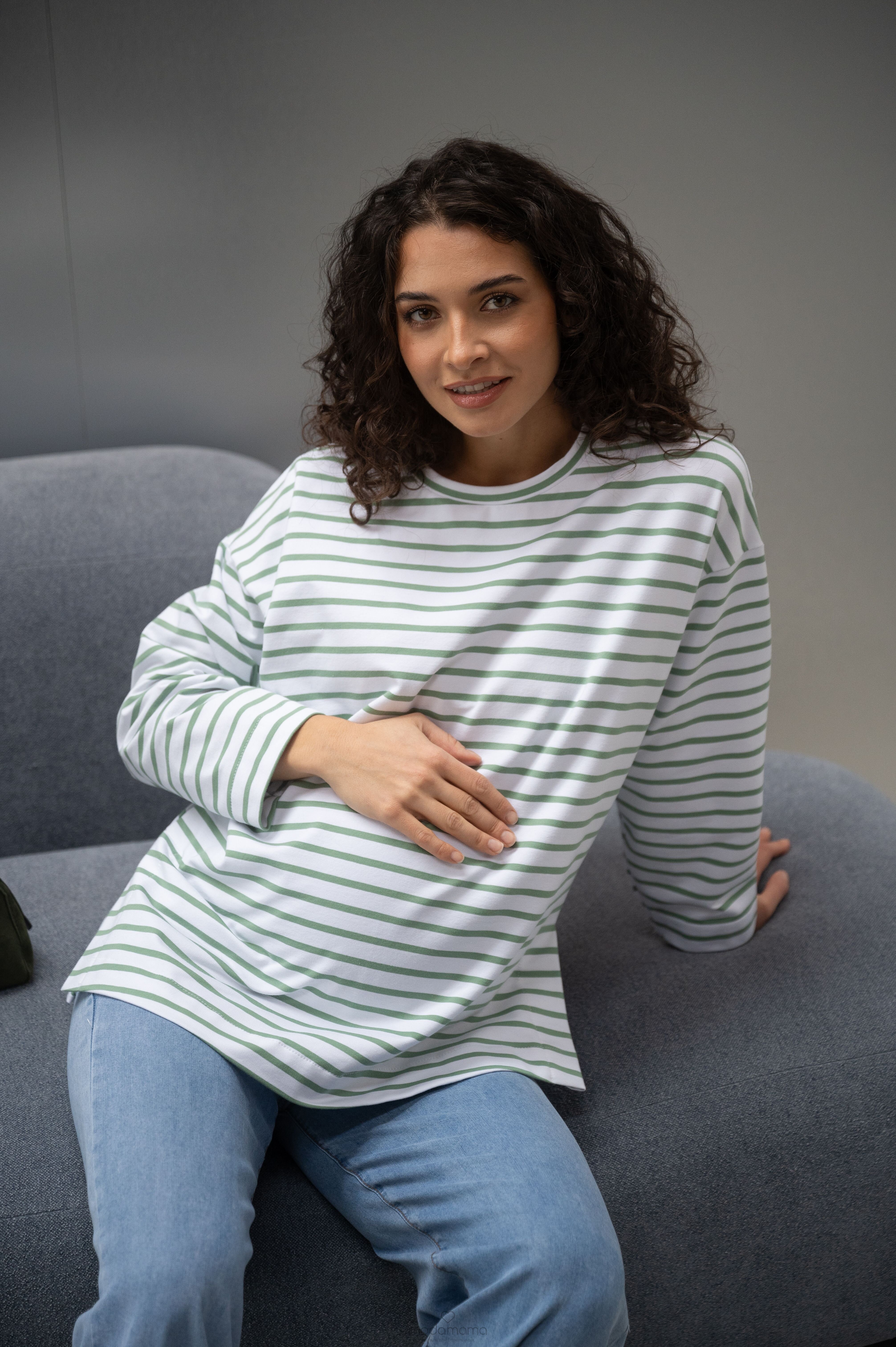 Джемпер для беременных универсального свободного кроя с разрезами по бокам и спущенным плечом в стиле оверсайз. Выполнен из мягкого хлопкового трикотажа футер-двухнитка.