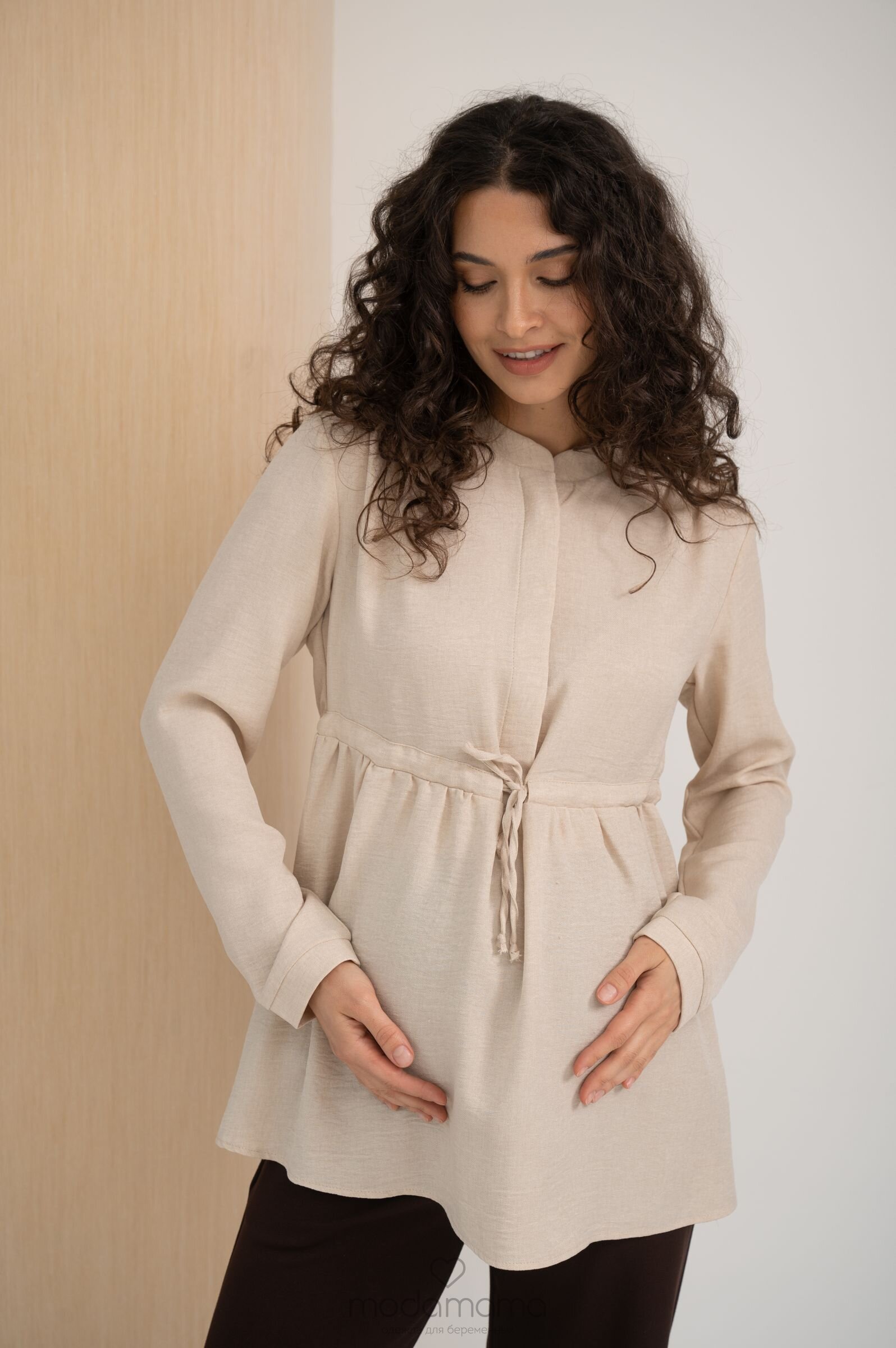 Блузка для беременных и кормящих мам свободного кроя с завышенной талией. Выполнено из лёгкой дышащей плательной ткани с льняным переплетением и лёгким эффектом жатости. Объём под грудью регулируется кулиской со шнурком. Секрет для кормления- в планке на груди с потайными пуговицами.