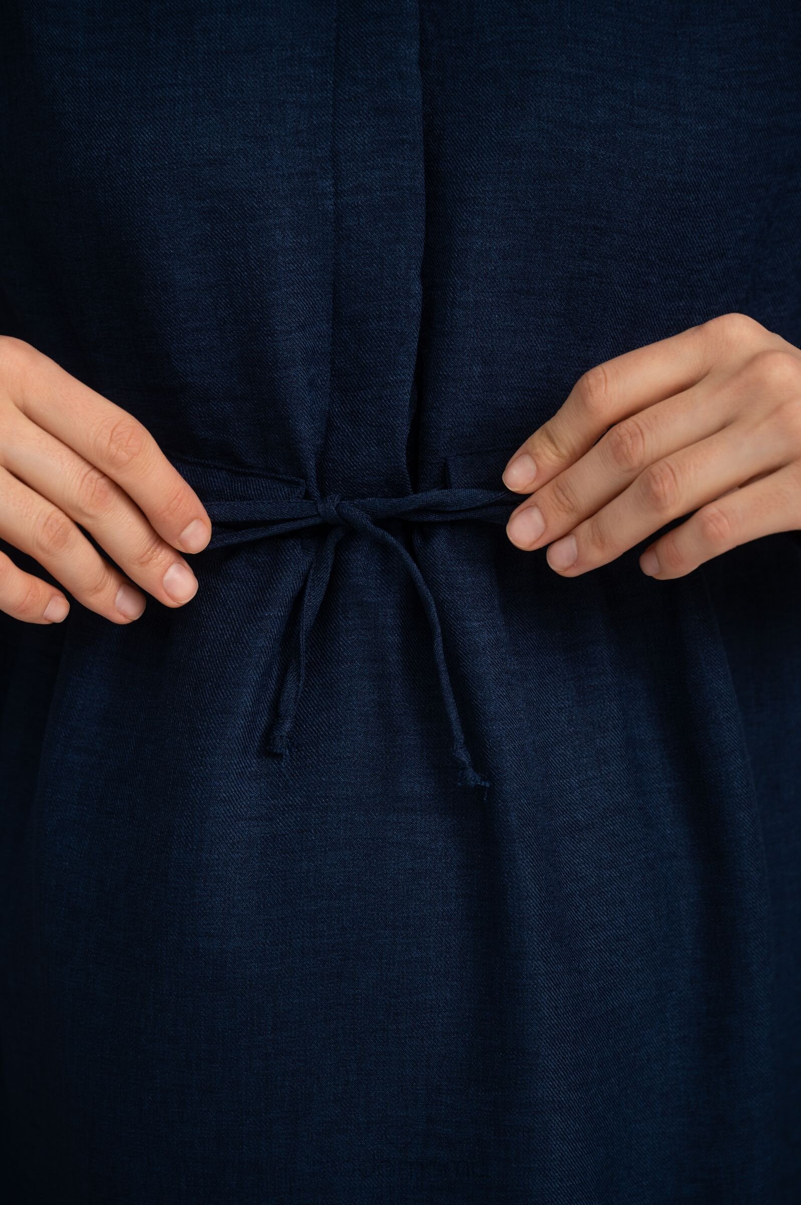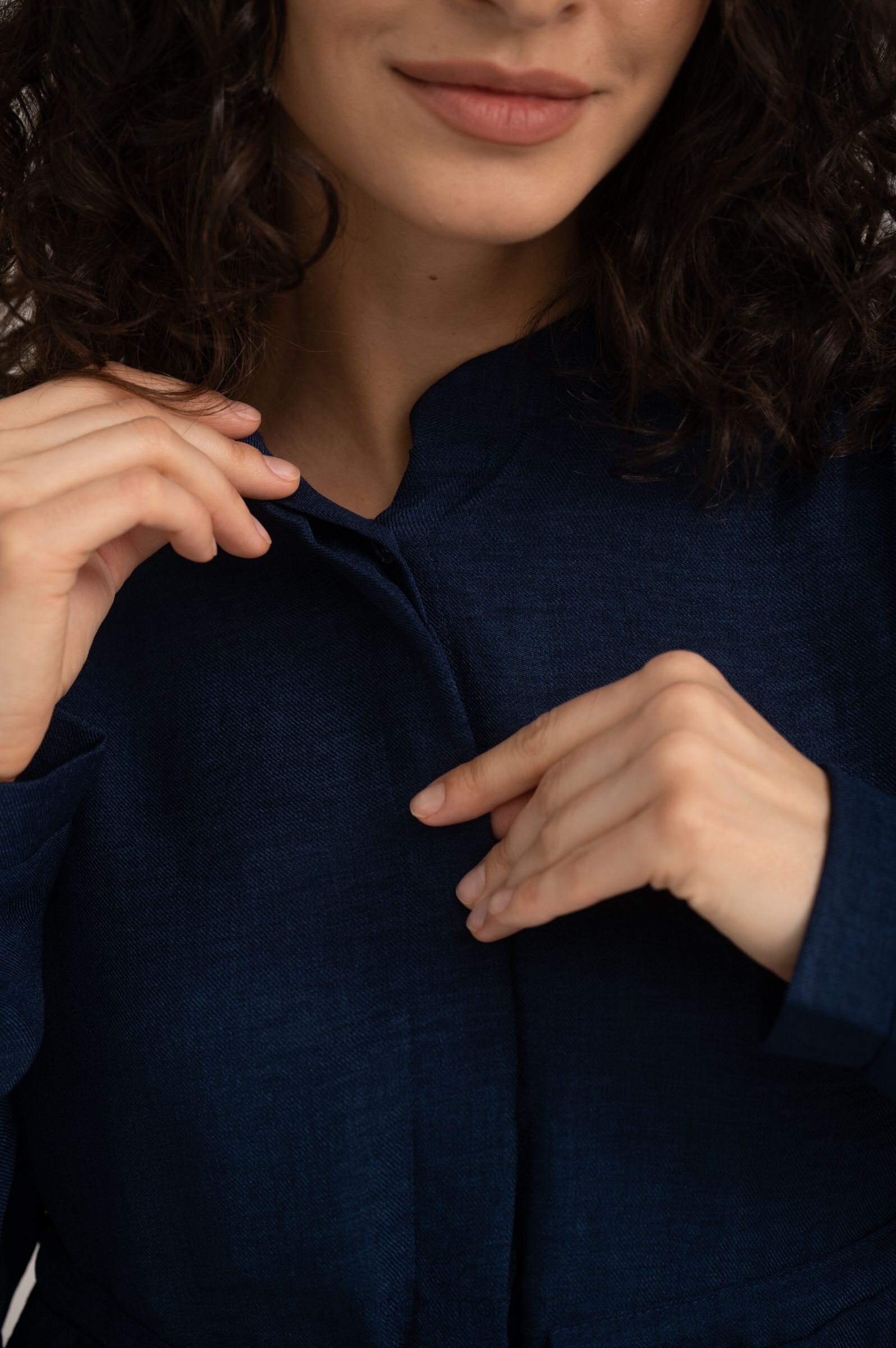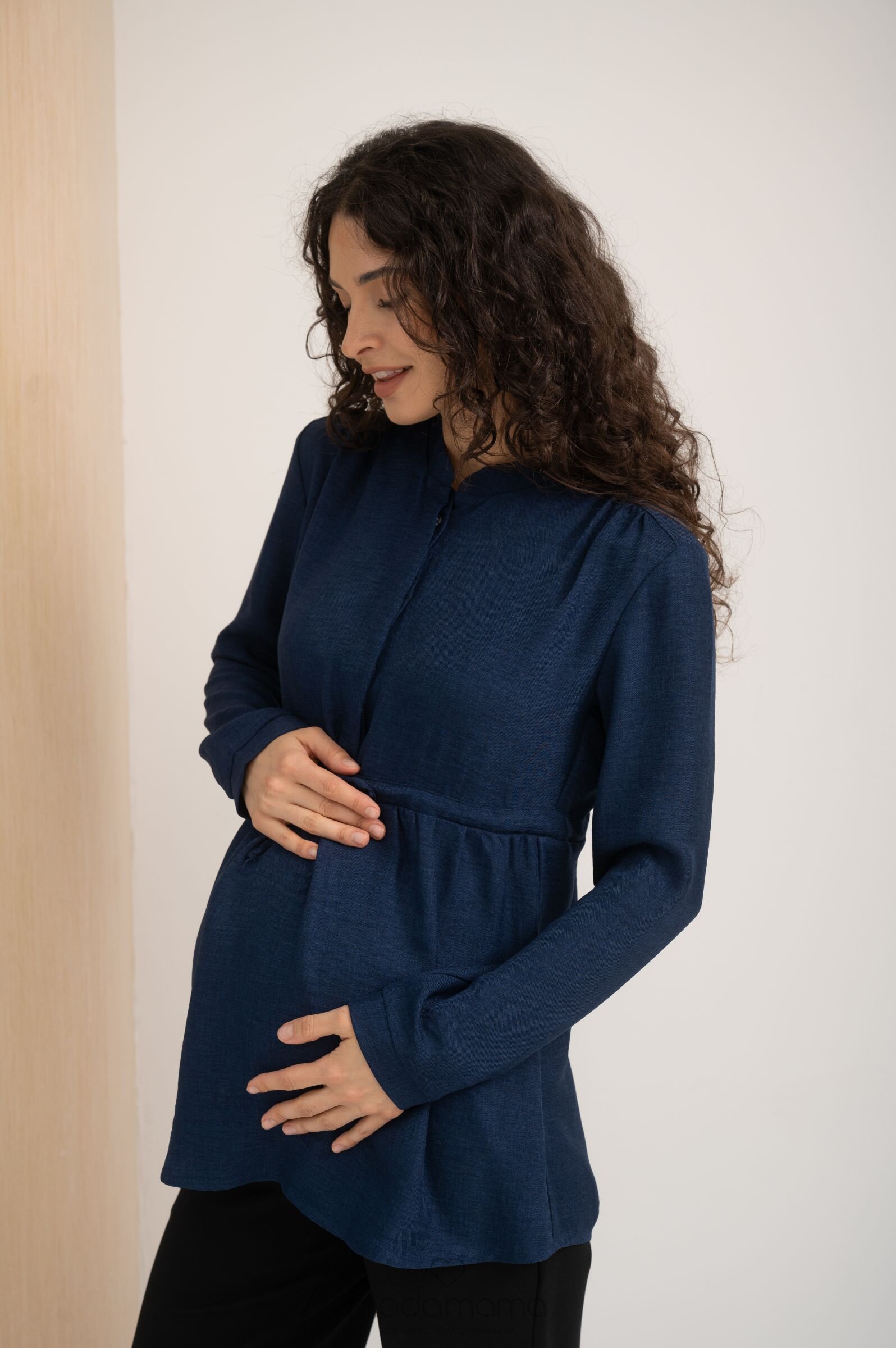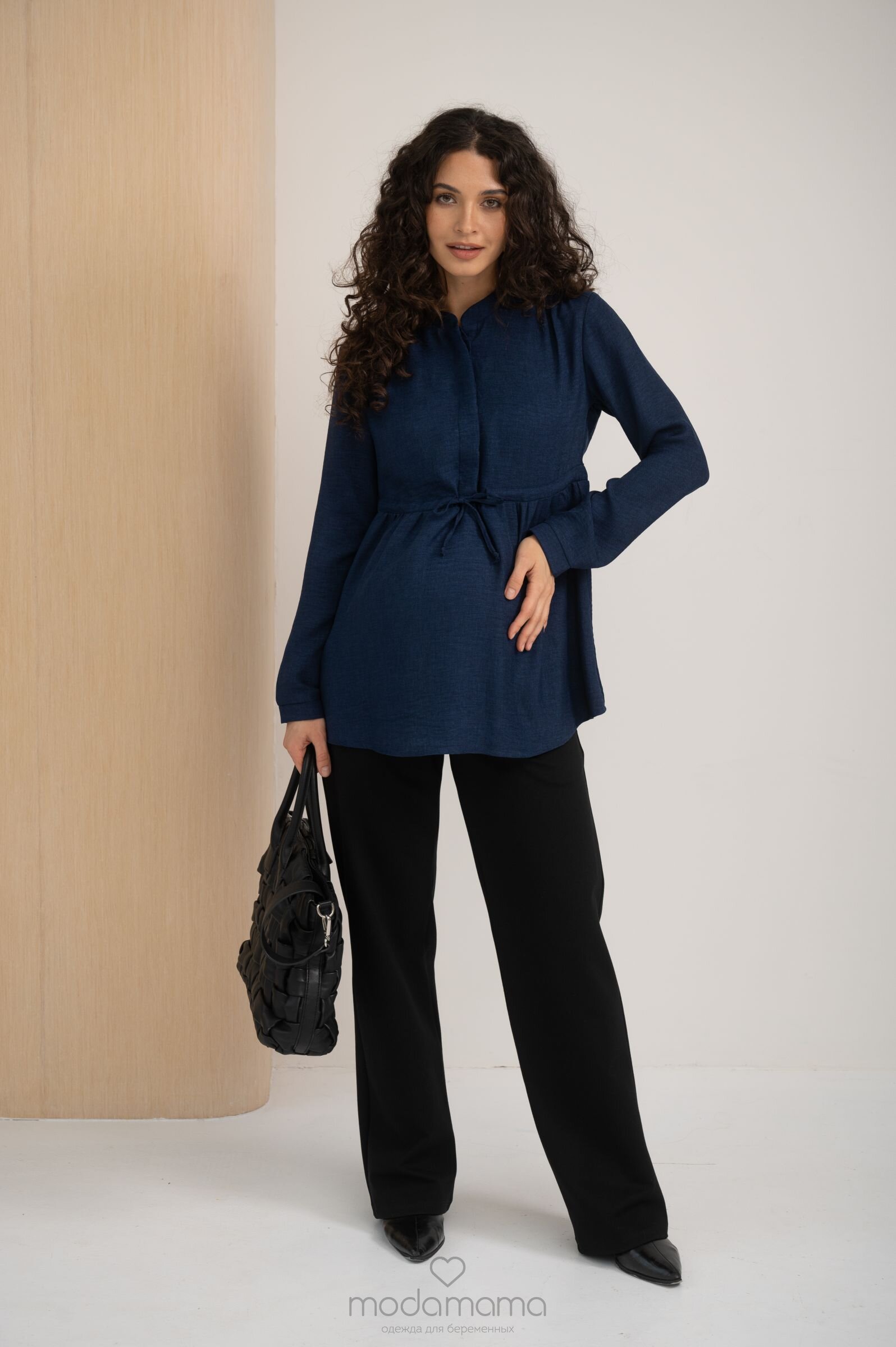 Блузка для беременных и кормящих мам свободного кроя с завышенной талией. Выполнено из лёгкой дышащей плательной ткани с льняным переплетением и лёгким эффектом жатости. Объём под грудью регулируется кулиской со шнурком. Секрет для кормления- в планке на груди с потайными пуговицами.