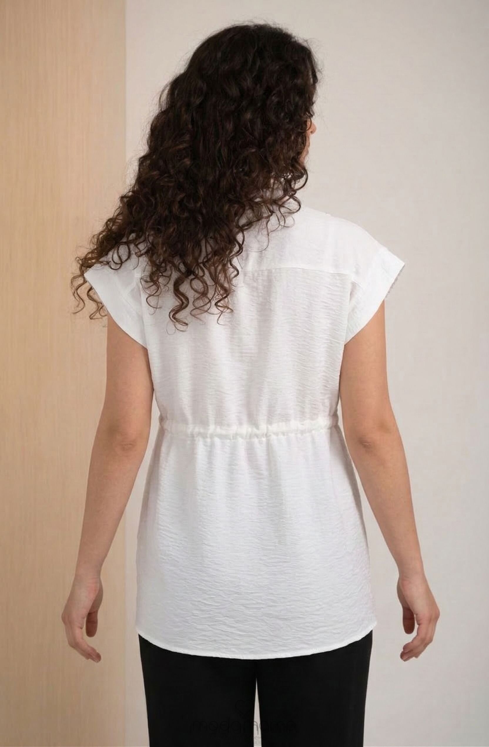 Блузка для беременных и кормящих мам свободного кроя с завышенной талией. Выполнено из лёгкой дышащей плательной ткани с лёгким эффектом жатости. Объём под грудью регулируется кулиской со шнурком. Секрет для кормления- в планке на груди с потайными пуговицами.