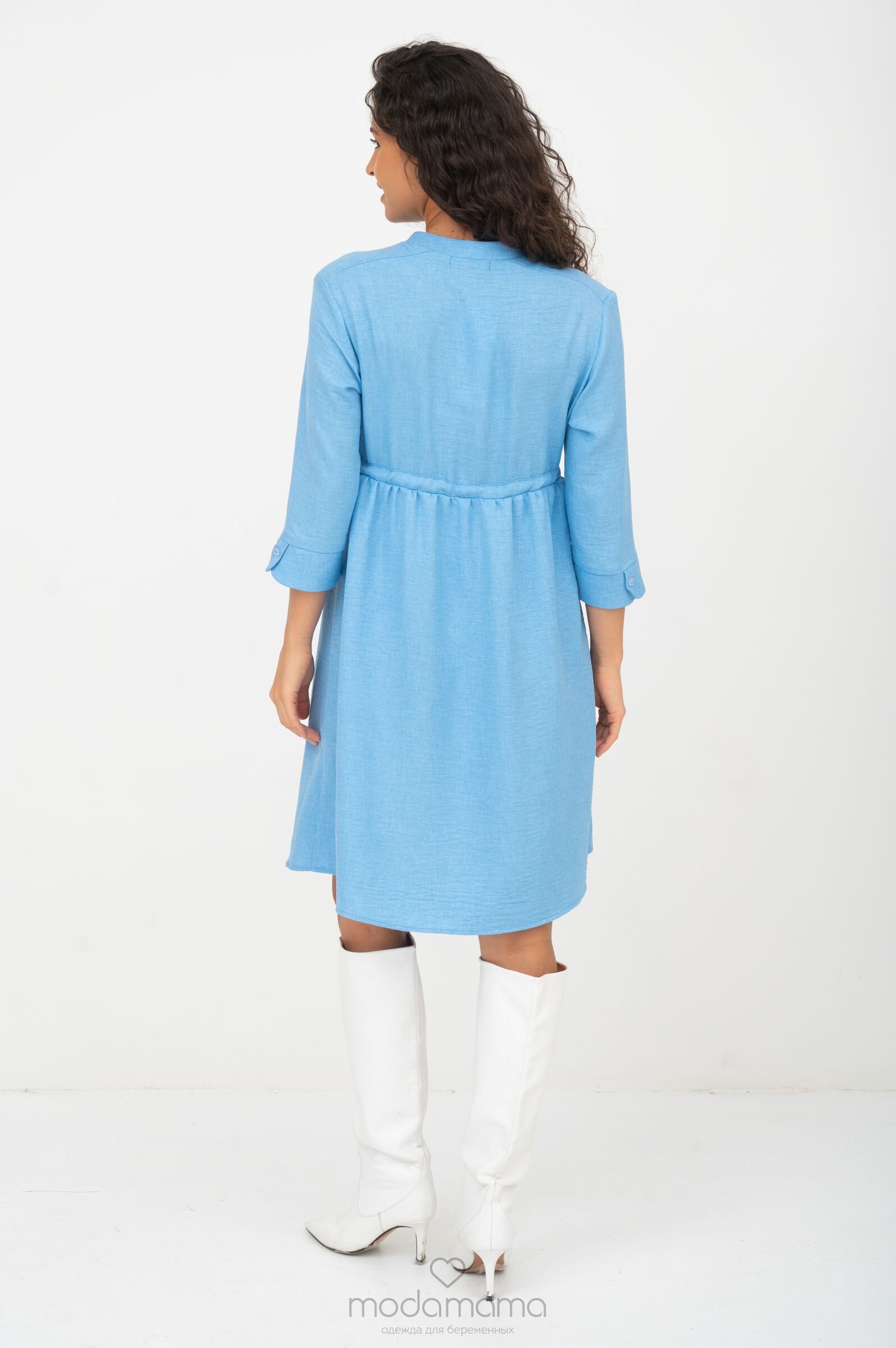 Платье для беременных и кормящих мам свободного кроя с завышенной талией. Объём под грудью регулируется кулиской со шнурком. Выполнено из лёгкой дышащей плательной ткани с льняным переплетением и лёгким эффектом жатости. Секрет для кормления- в планке на груди с потайными пуговицами.