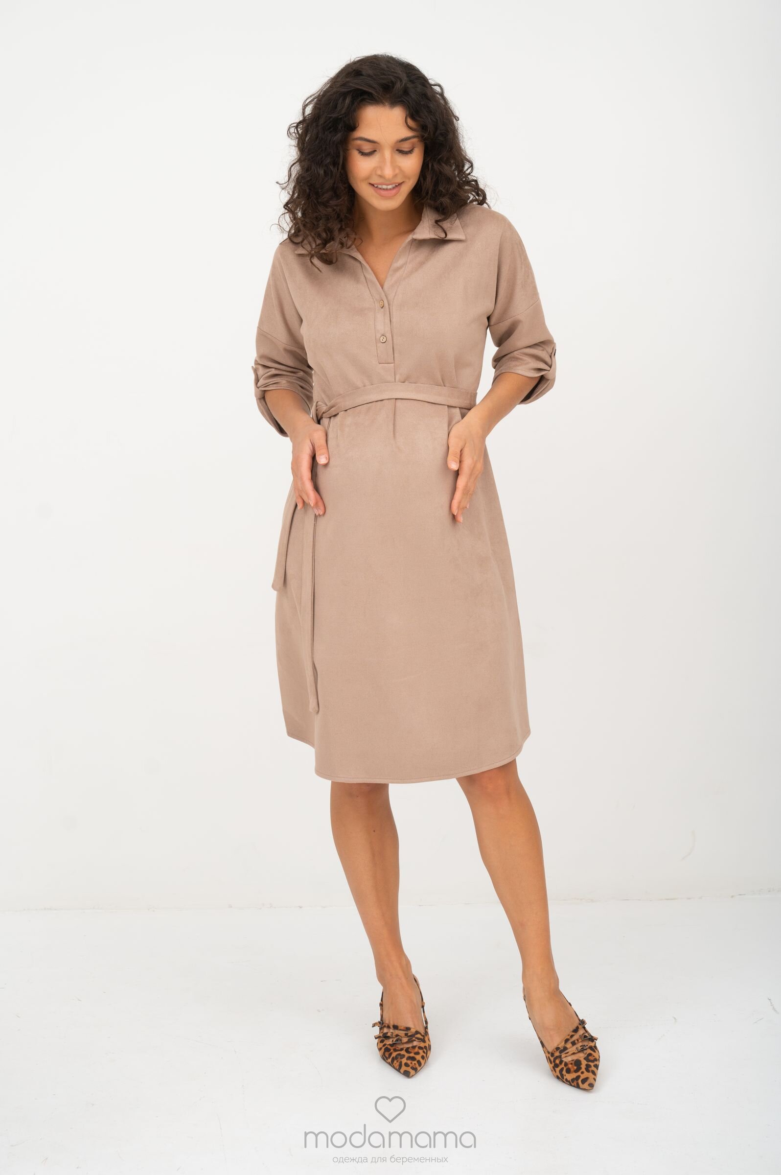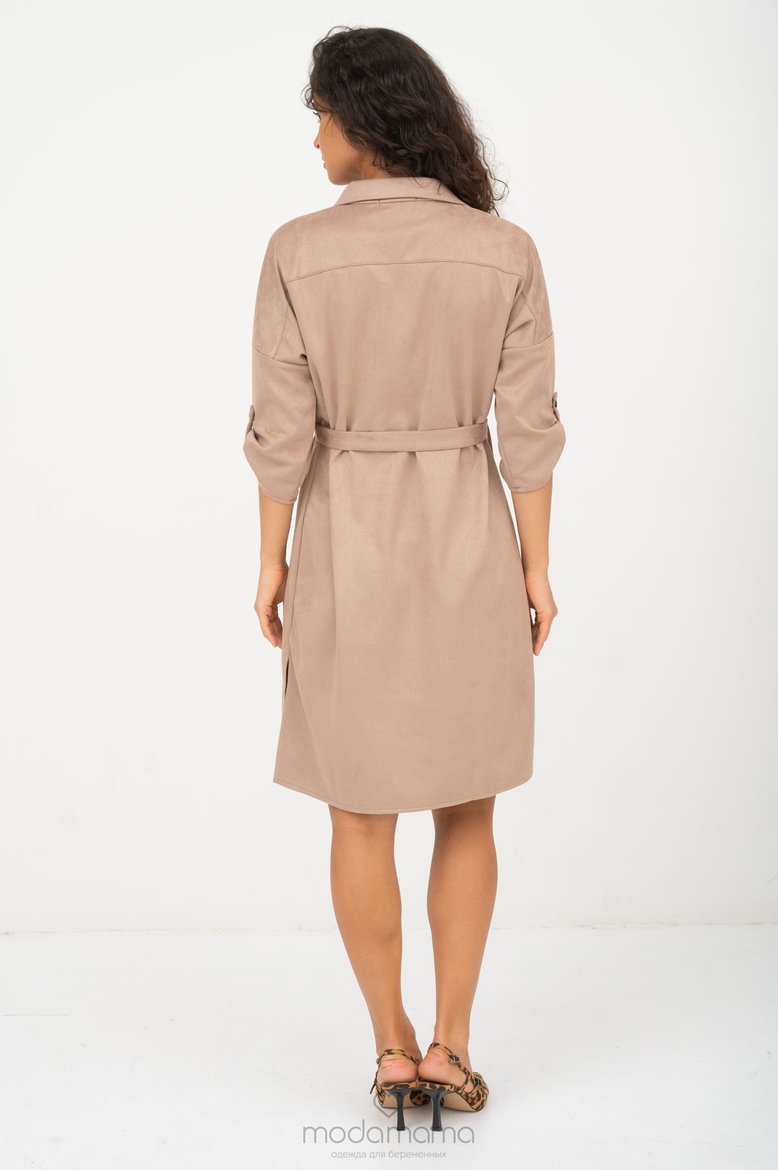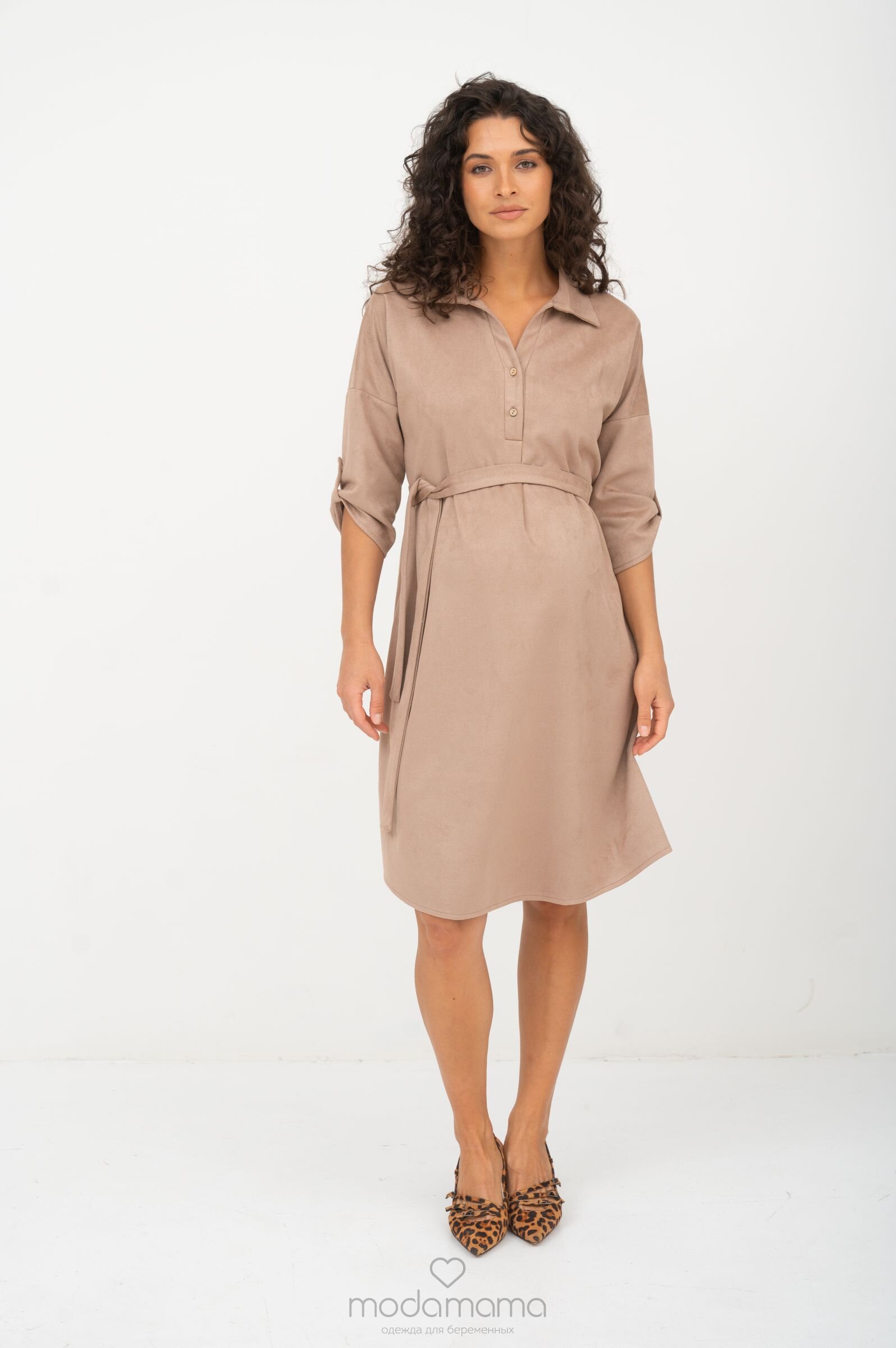 Платье-рубашка прямого силуэта для беременных и кормящих мам. Под грудью заложен защип для растущего животика. Благодаря съёмному поясу, можно подчеркнуть талию или носить после беременности. Рукава 3/4 застегиваются на пату, длину рукава можно регулировать. Секрет для кормления - в планке на груди. Выполнено из мягкого, эластичного материала средней плотности с ворсистой замшевой лицевой стороной и гладкой трикотажной изнанки.
