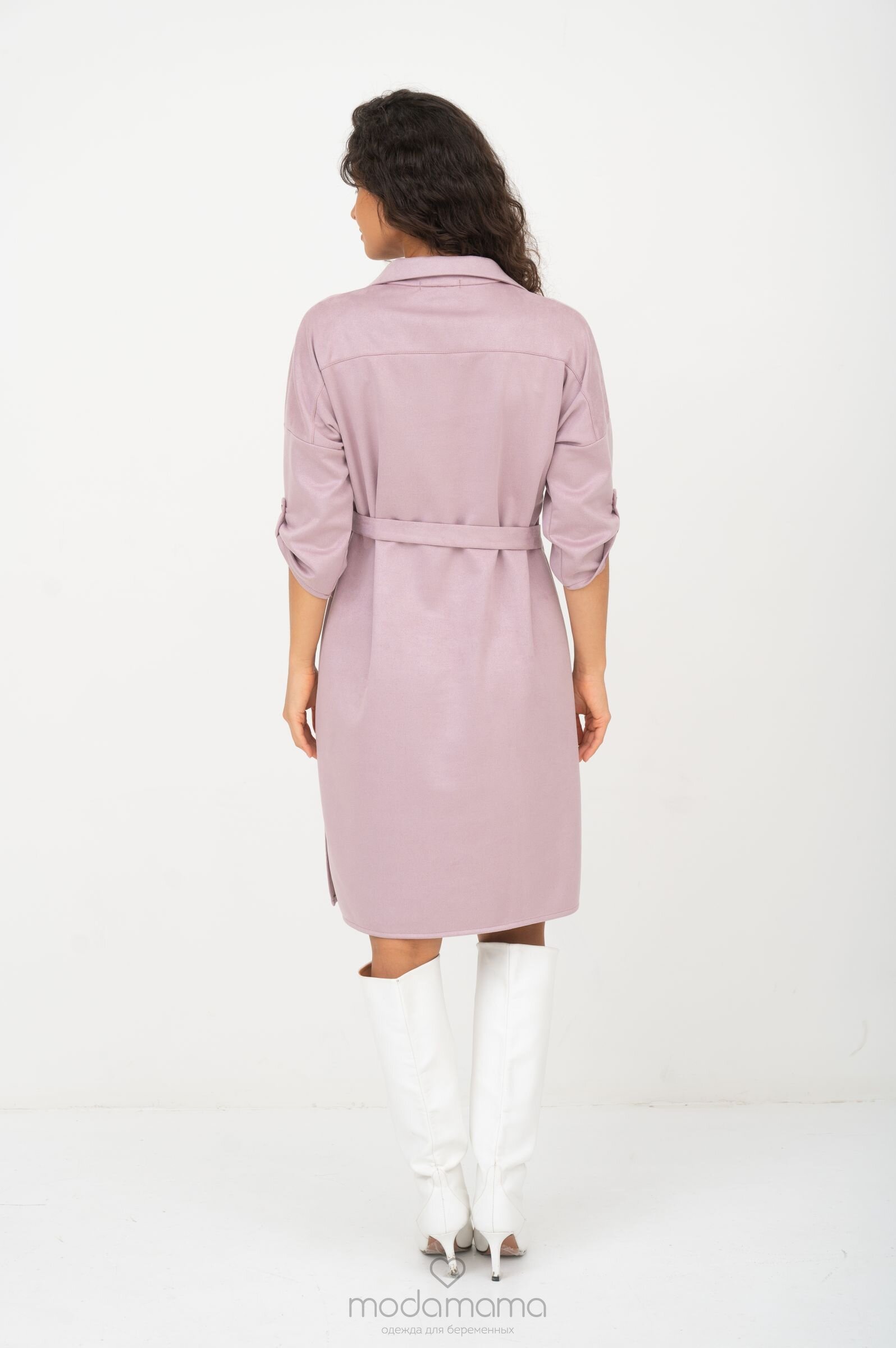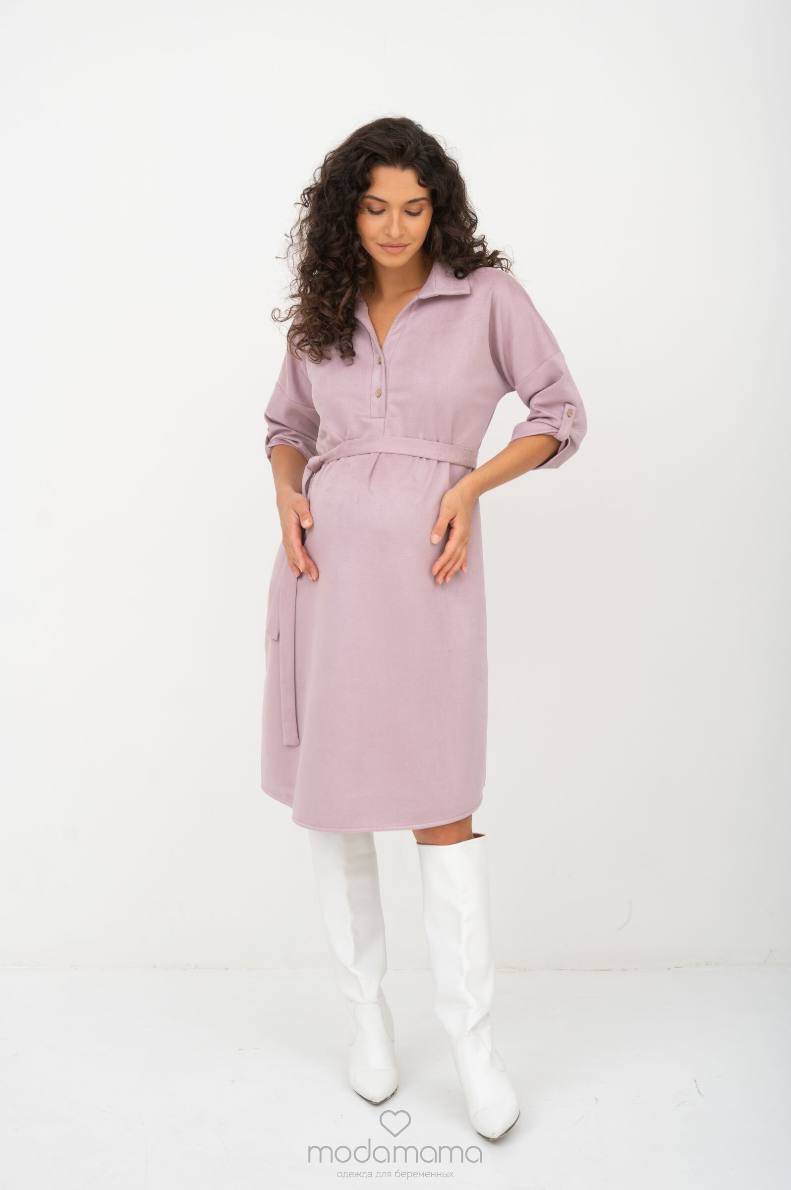 Платье-рубашка прямого силуэта для беременных и кормящих мам. Под грудью заложен защип для растущего животика. Благодаря съёмному поясу, можно подчеркнуть талию или носить после беременности. Рукава 3/4 застегиваются на пату, длину рукава можно регулировать. Секрет для кормления - в планке на груди. Выполнено из мягкого, эластичного материала средней плотности с ворсистой замшевой лицевой стороной и гладкой трикотажной изнанки.