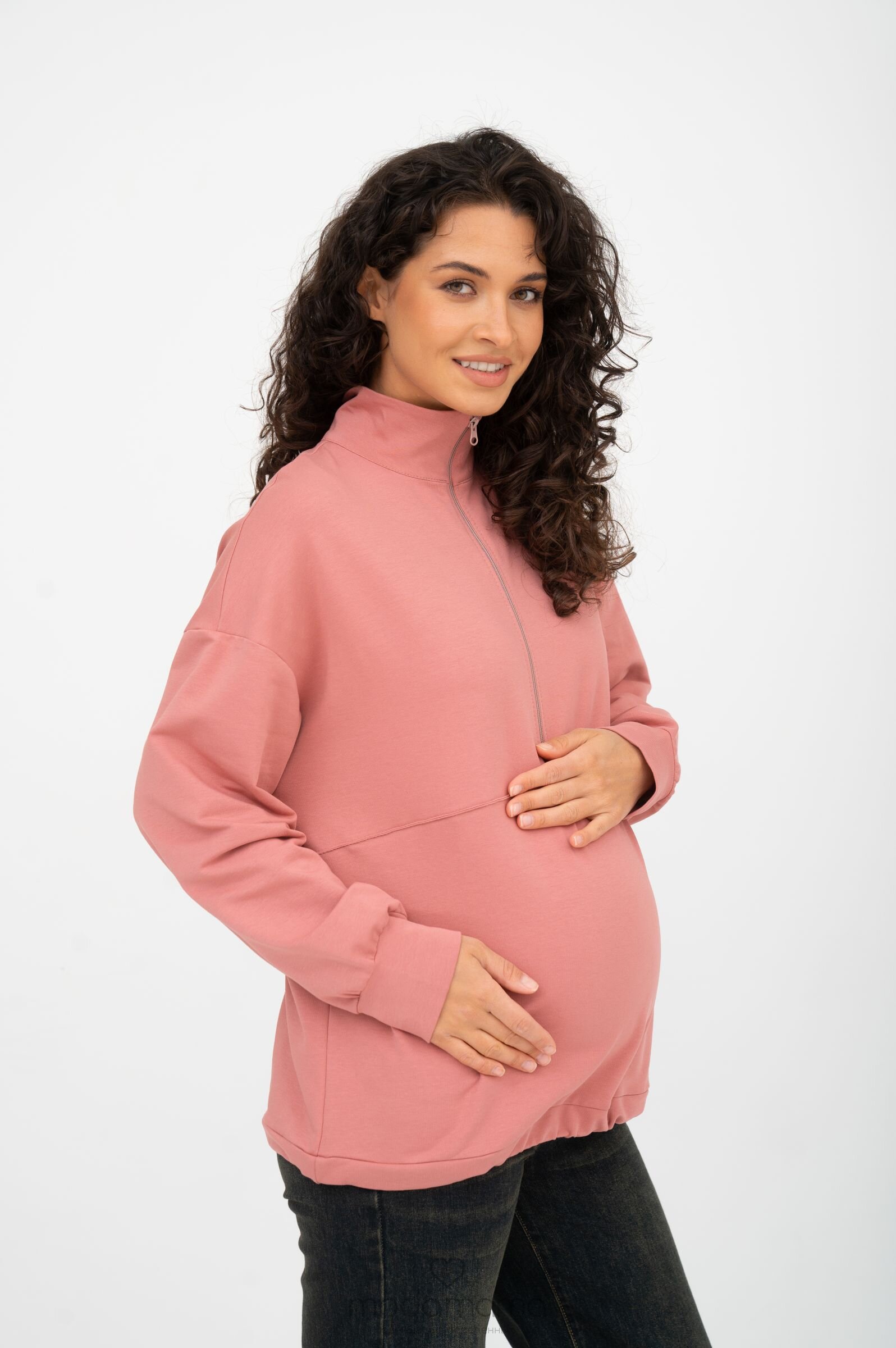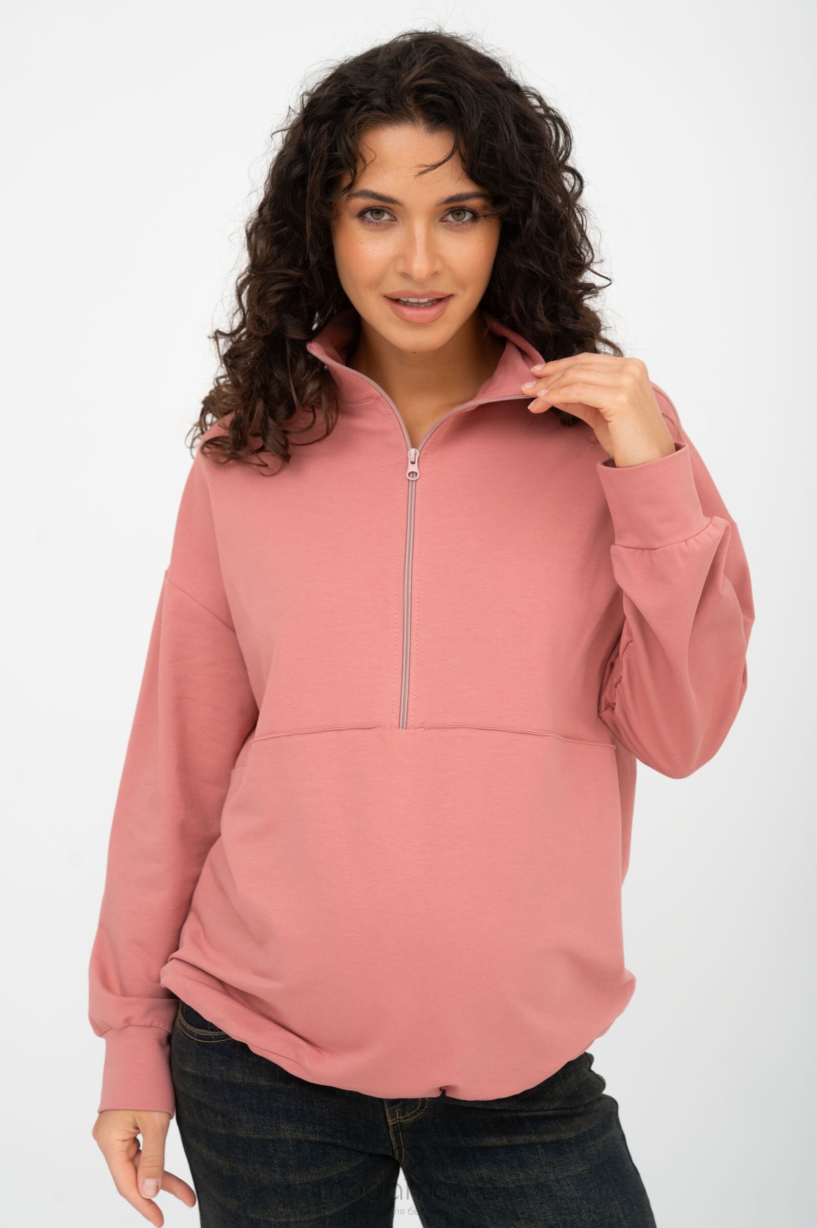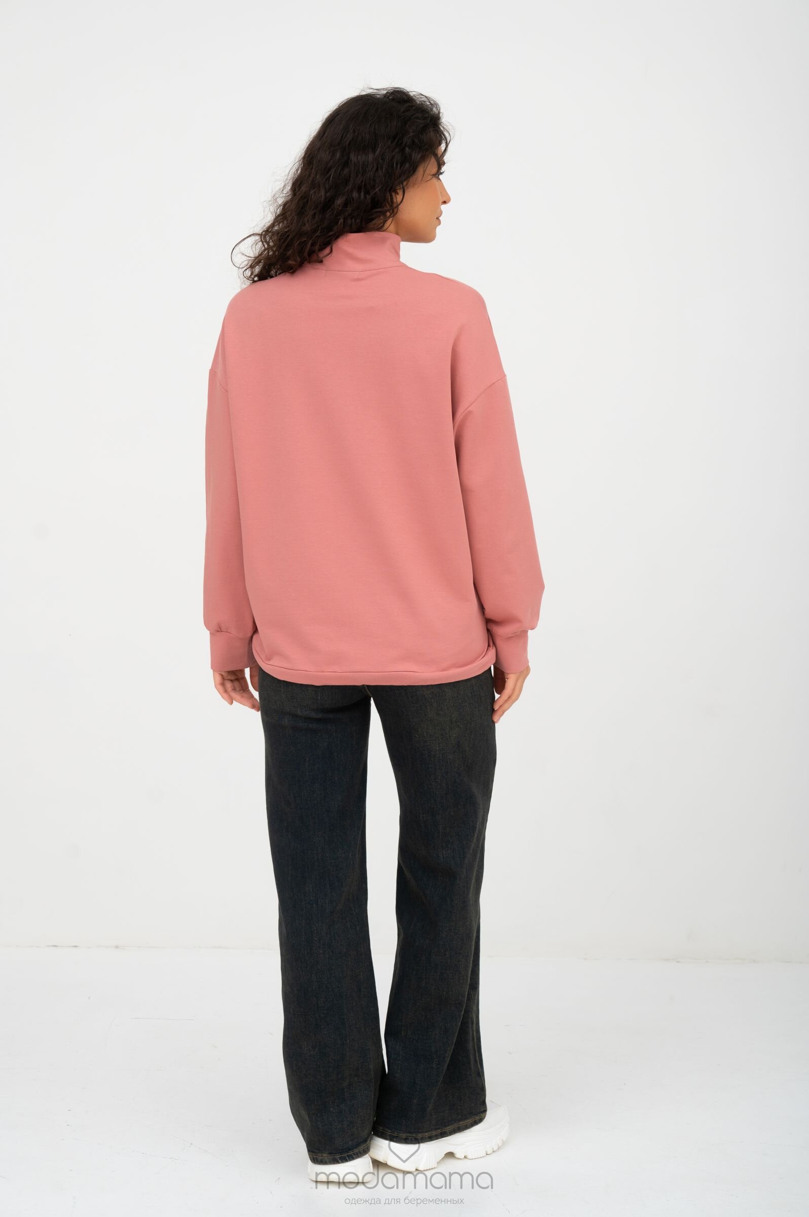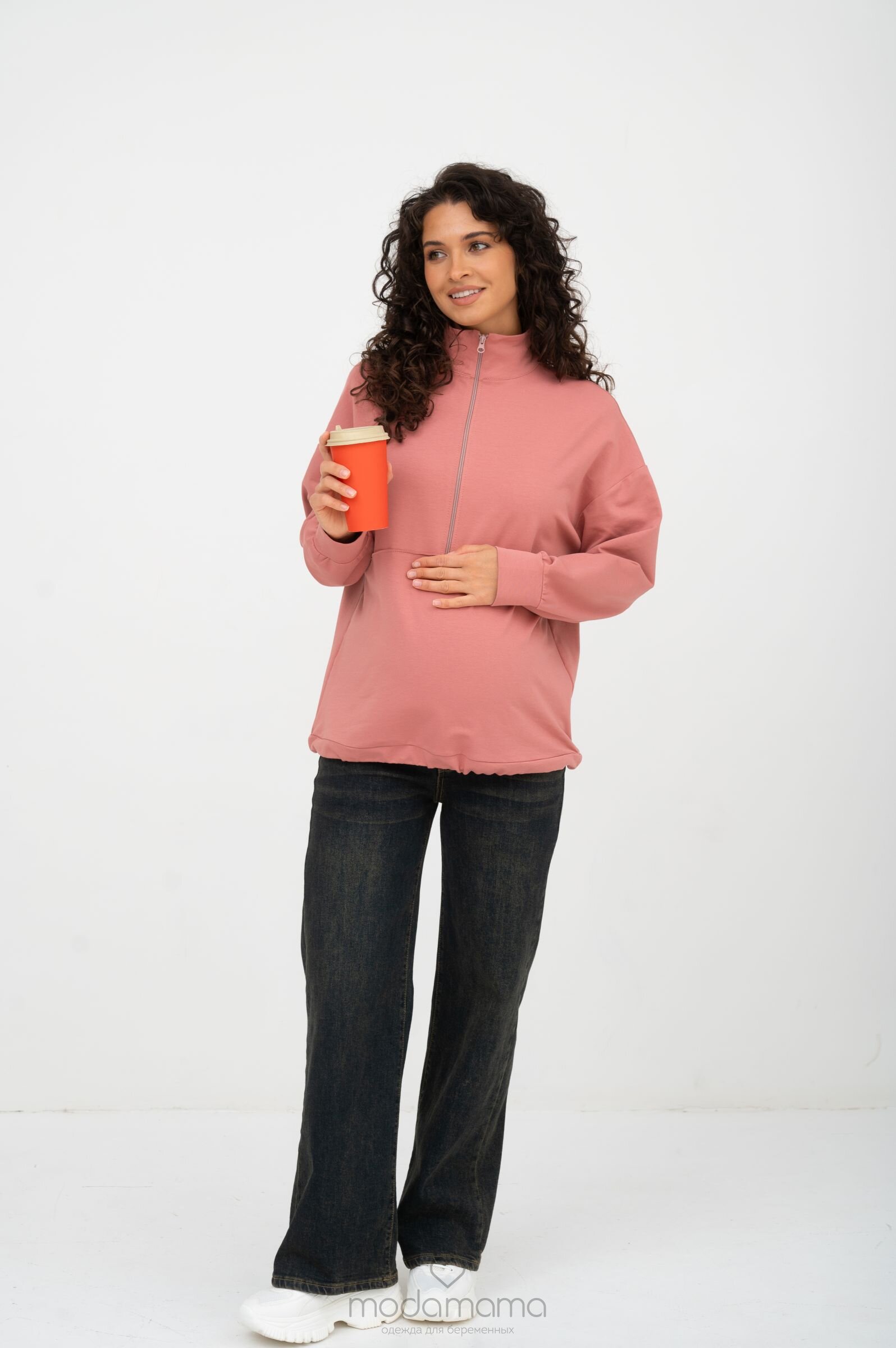Джемпер для беременных и кормящих мам с акцентной горизонтальной строчкой, резинкой-утяжкой по нижней части и воротником-стойкой на молнии. Выполнен из мягкого, эластичного трикотажа (футер 2-нитка).