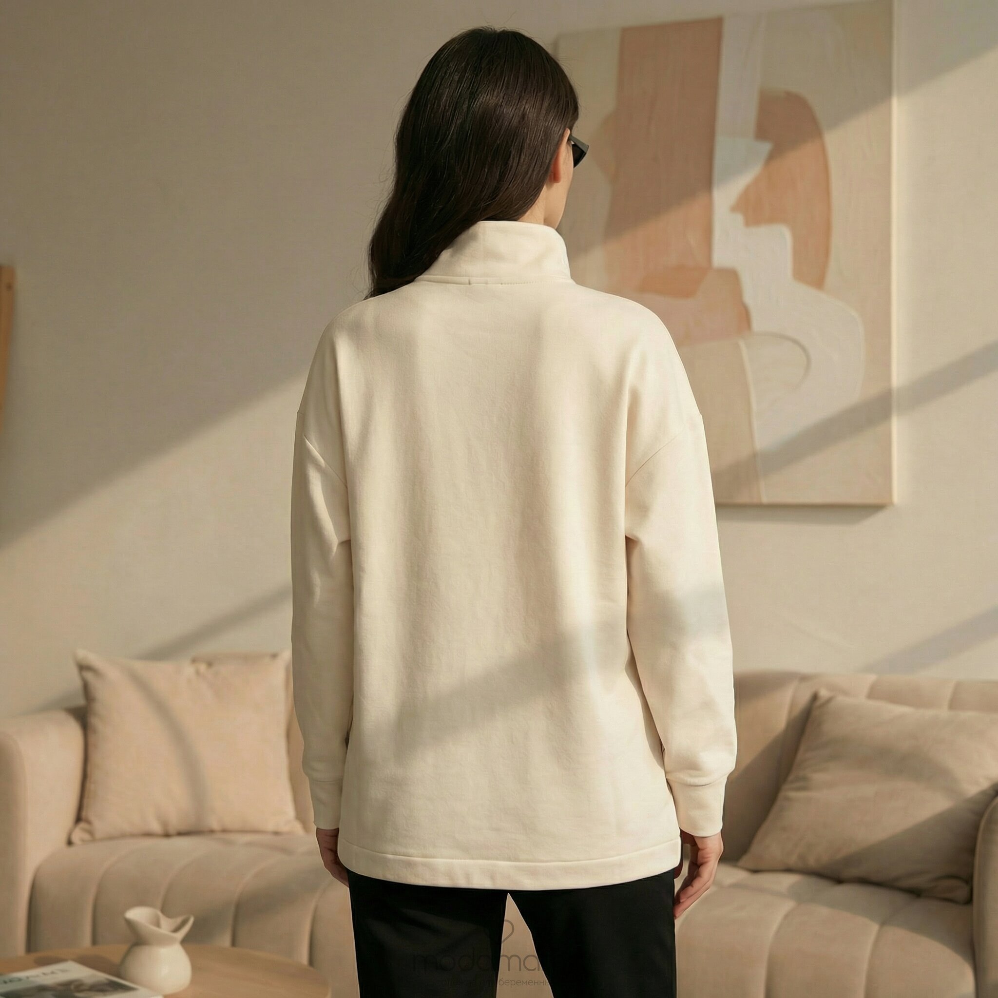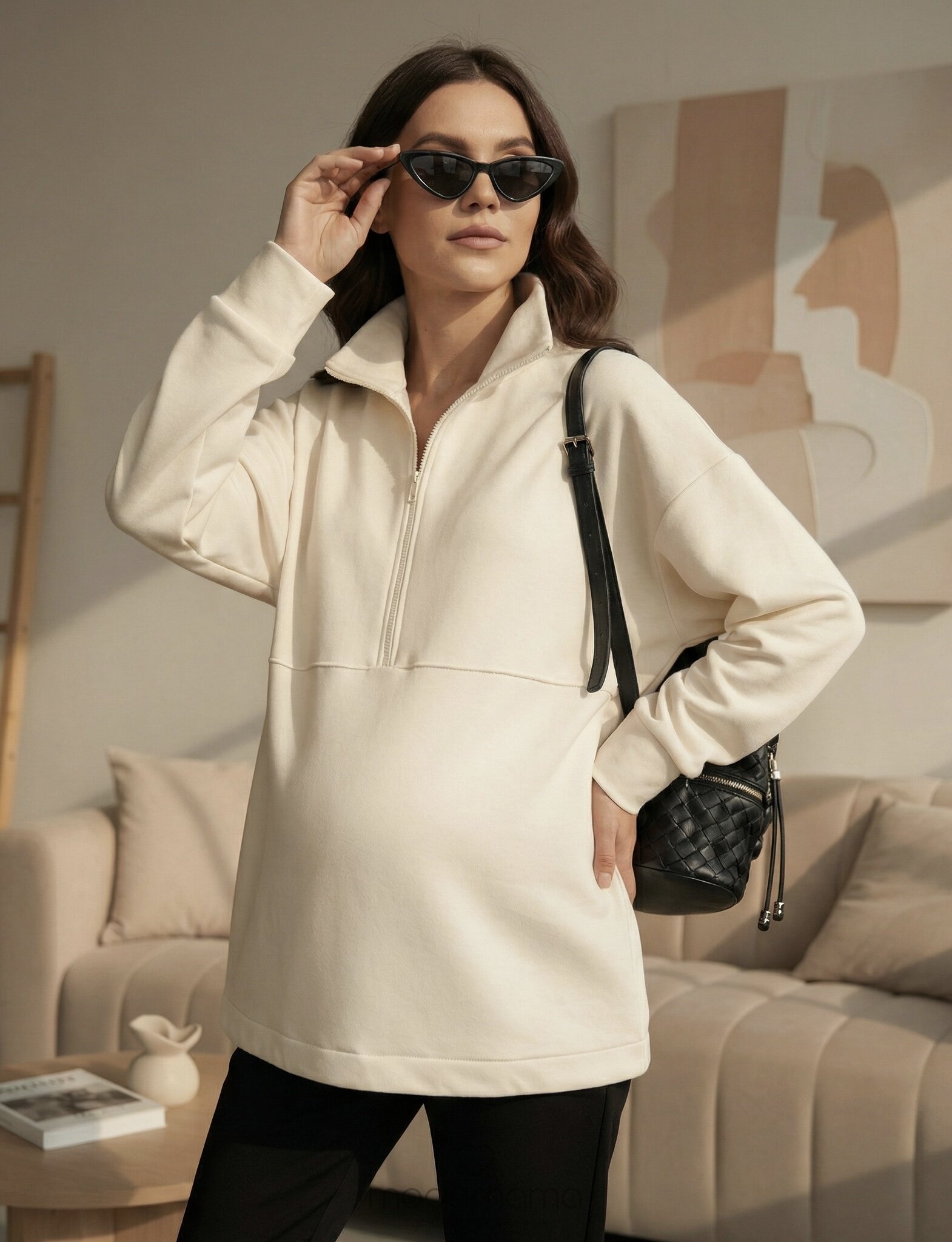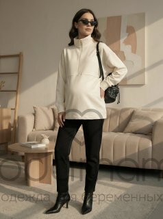 Джемпер для беременных и кормящих мам с акцентной горизонтальной строчкой, резинкой-утяжкой по нижней части и воротником-стойкой на молнии. Выполнен из мягкого, эластичного трикотажа (футер 2-нитка).