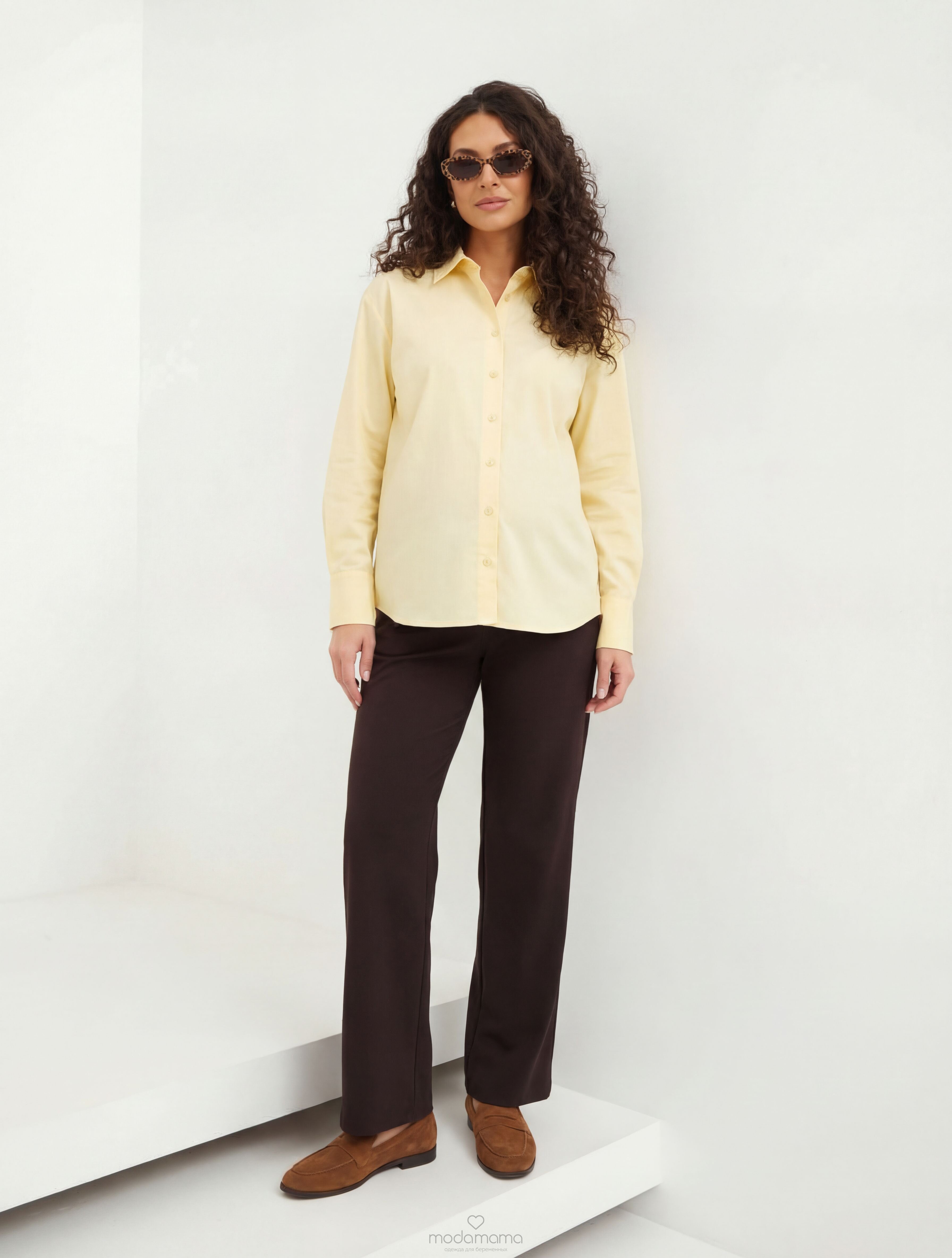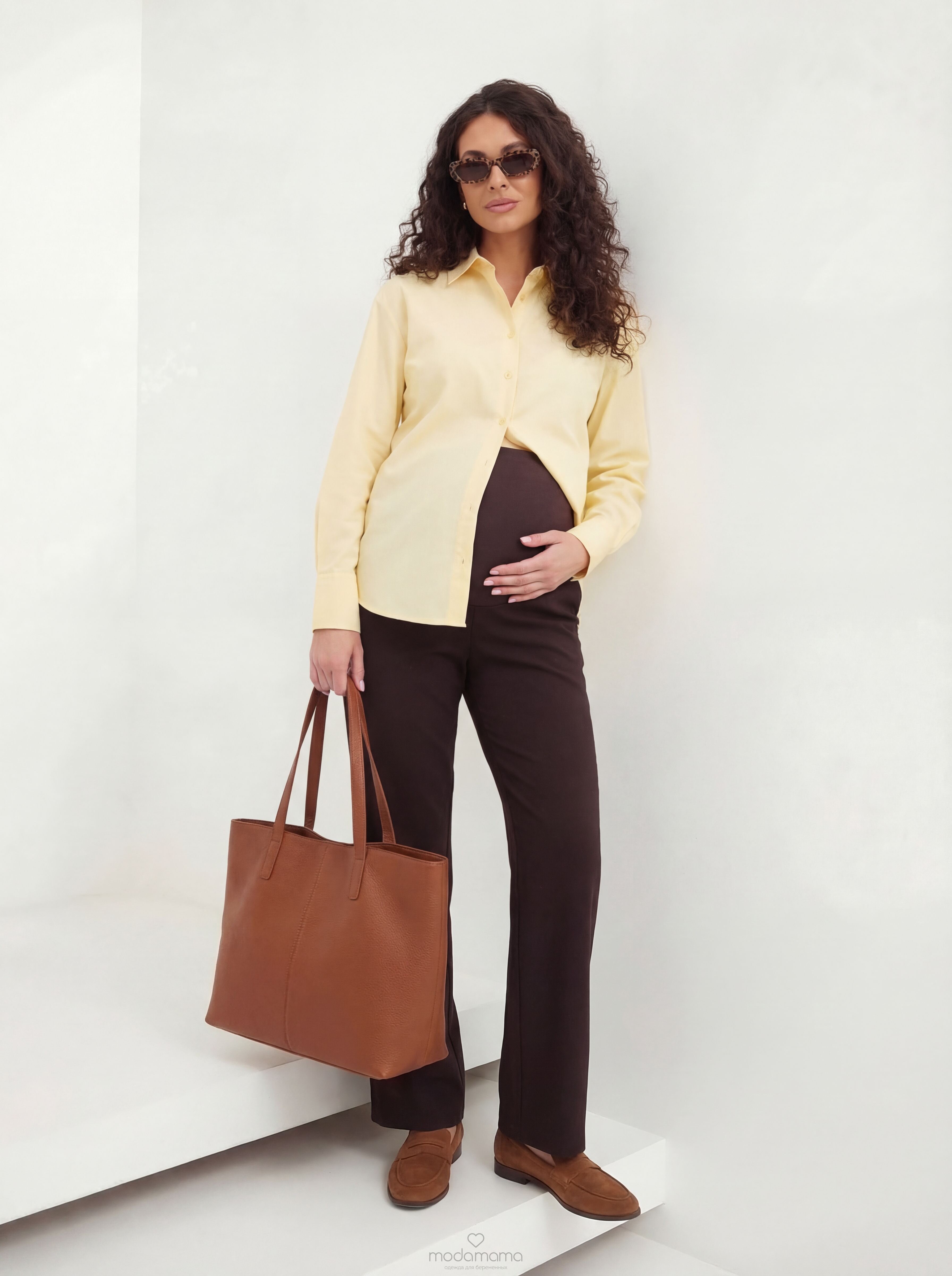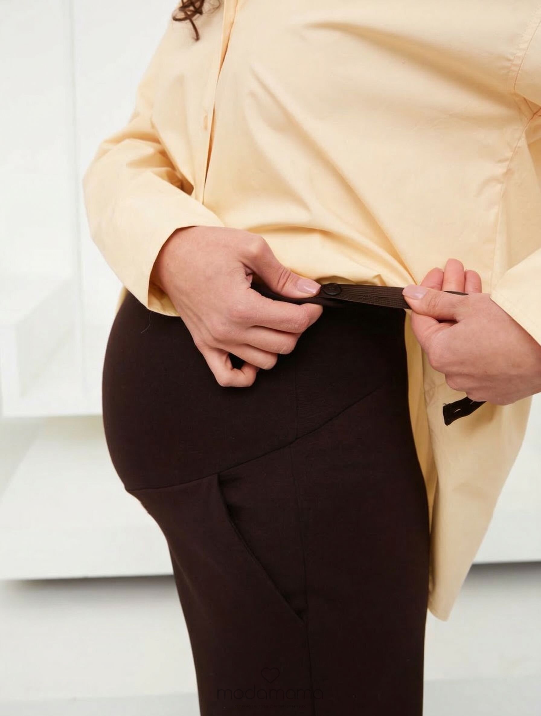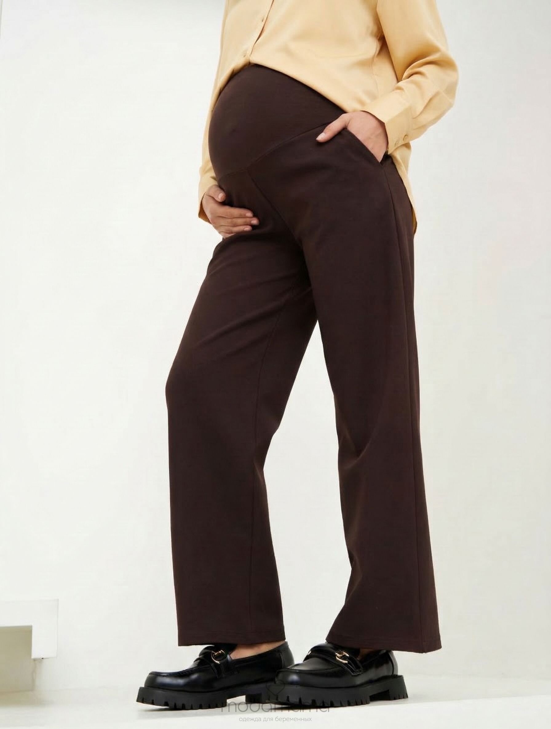 Базовые прямые брюки для беременных широкого кроя с карманами в боковых швах. Высокий круговой трикотажный бандаж регулируется пуговкой по верху. Выполнены из тянущегося плотного трикотажа премиум-джерси без утепления. Внимание: мы скорректировали размерную сетку, поэтому брюки больше не большемерят!