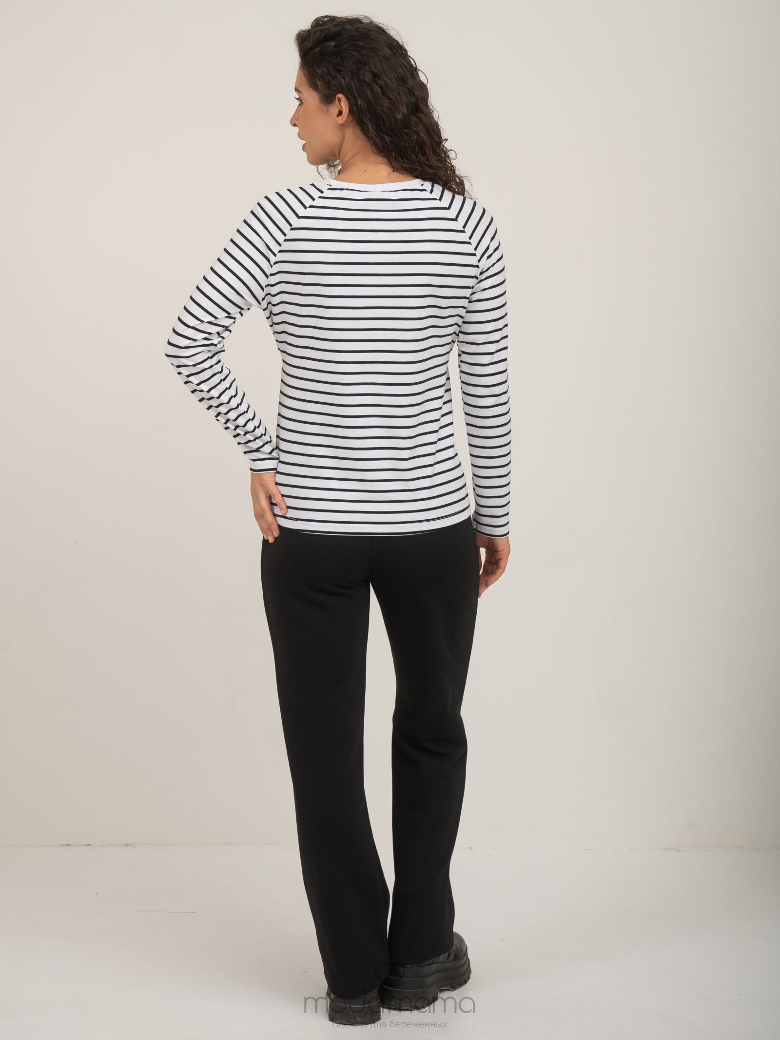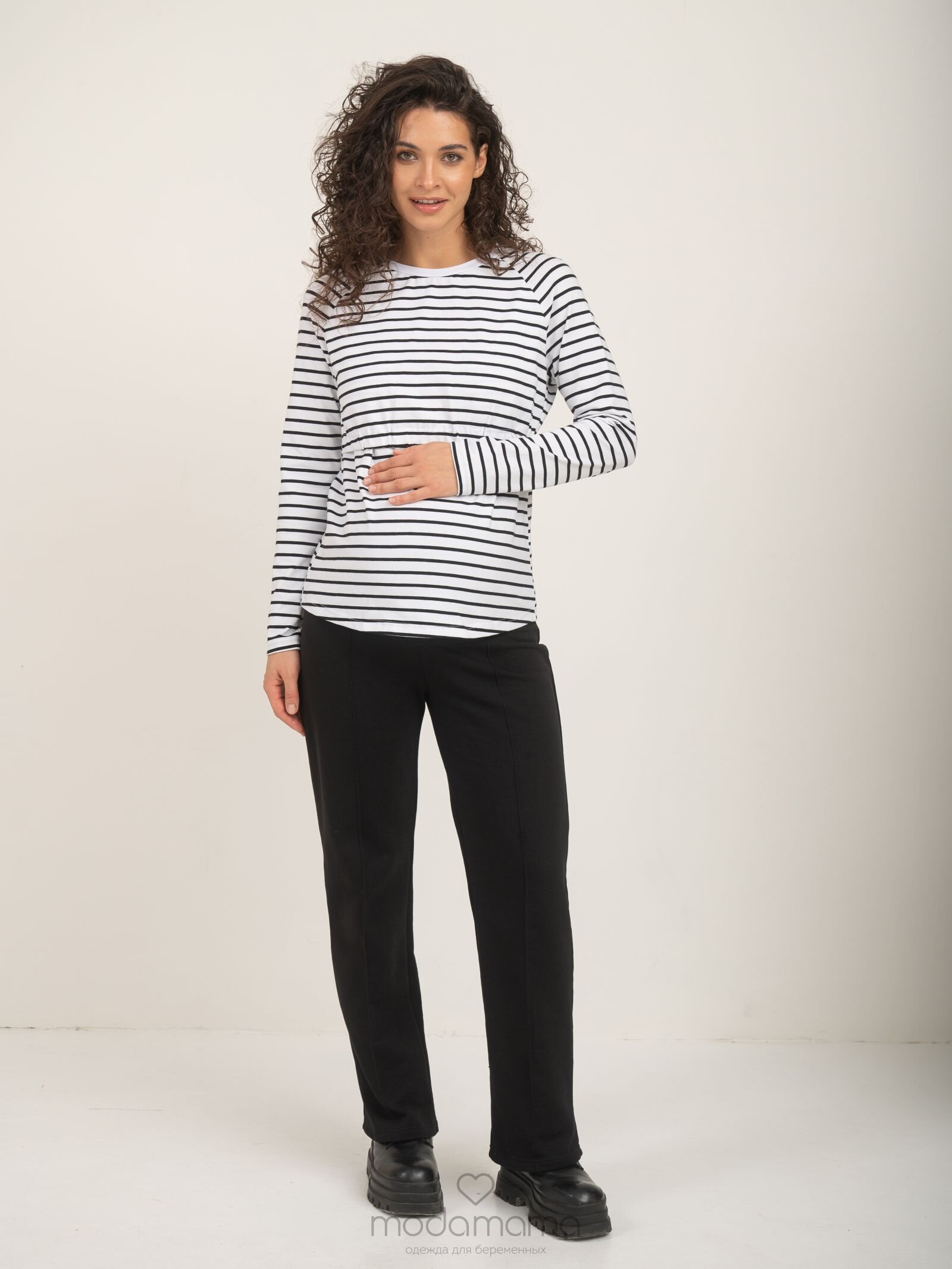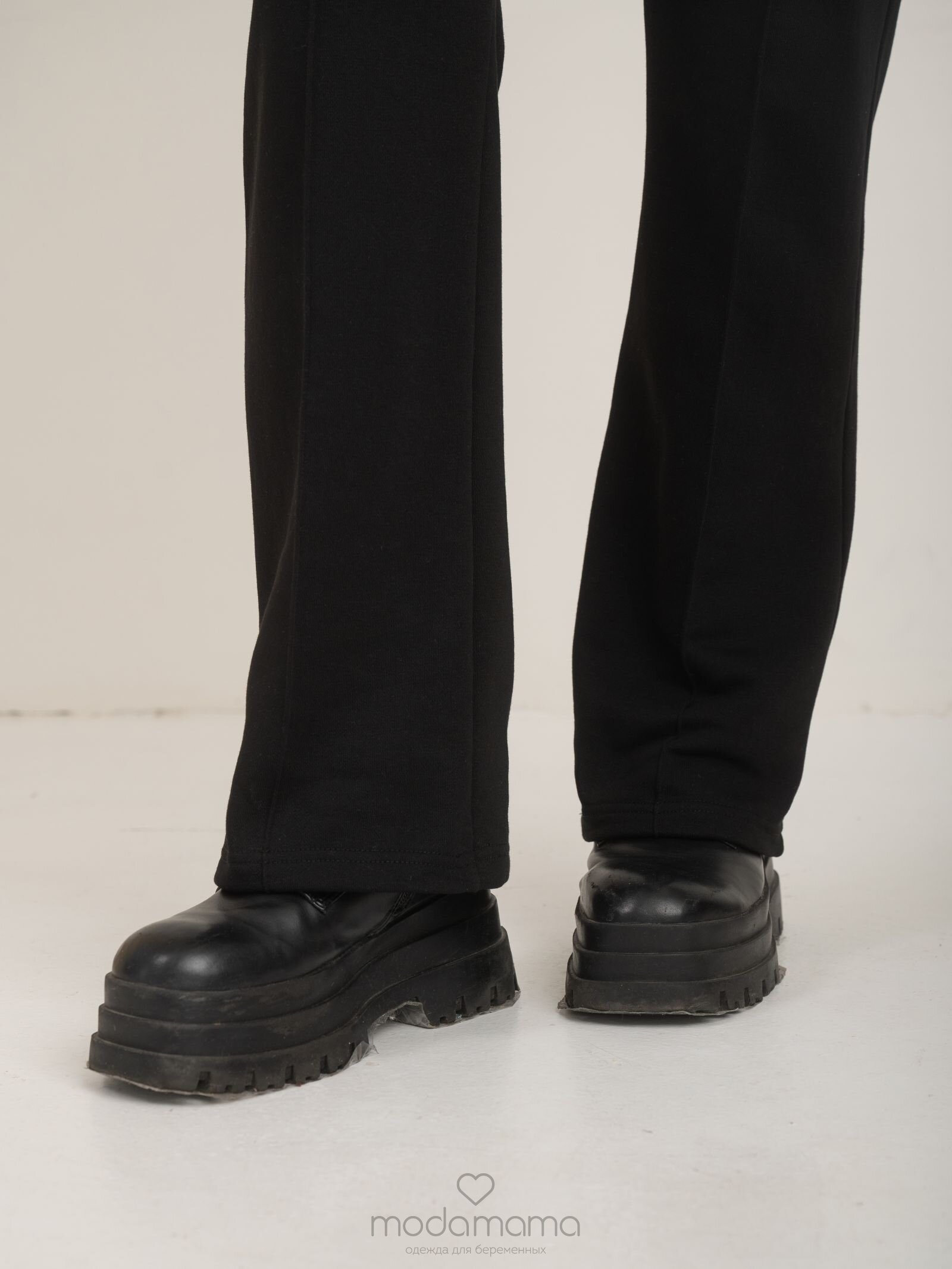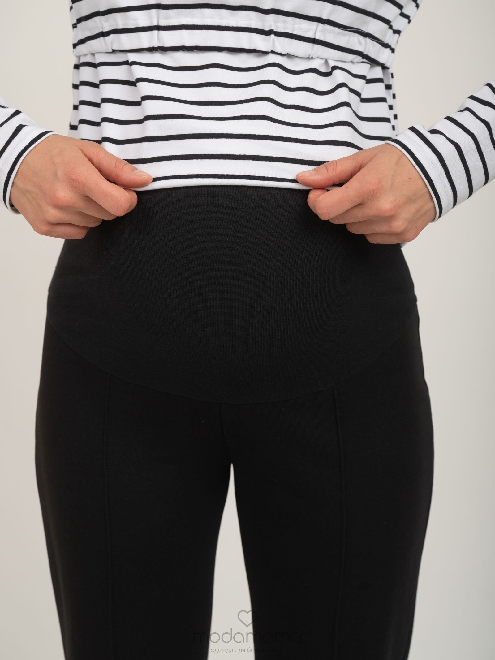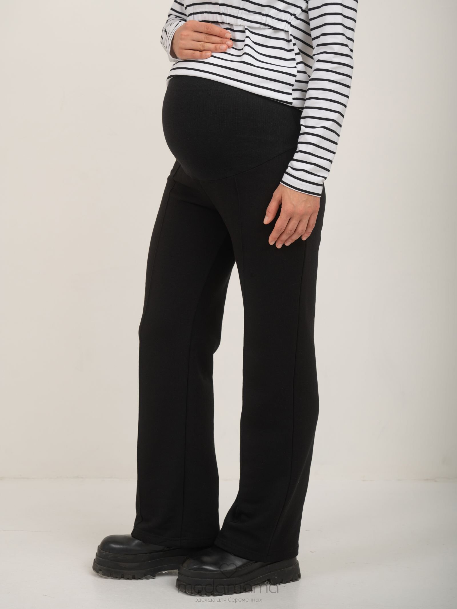Брюки для беременных прямого кроя с отстроченными вертикальными стрелками. Высокий круговой трикотажный бандаж регулируется пуговкой по верху. Выполнены из мягкого, тянущегося трикотажа (футер-трёхнитка).