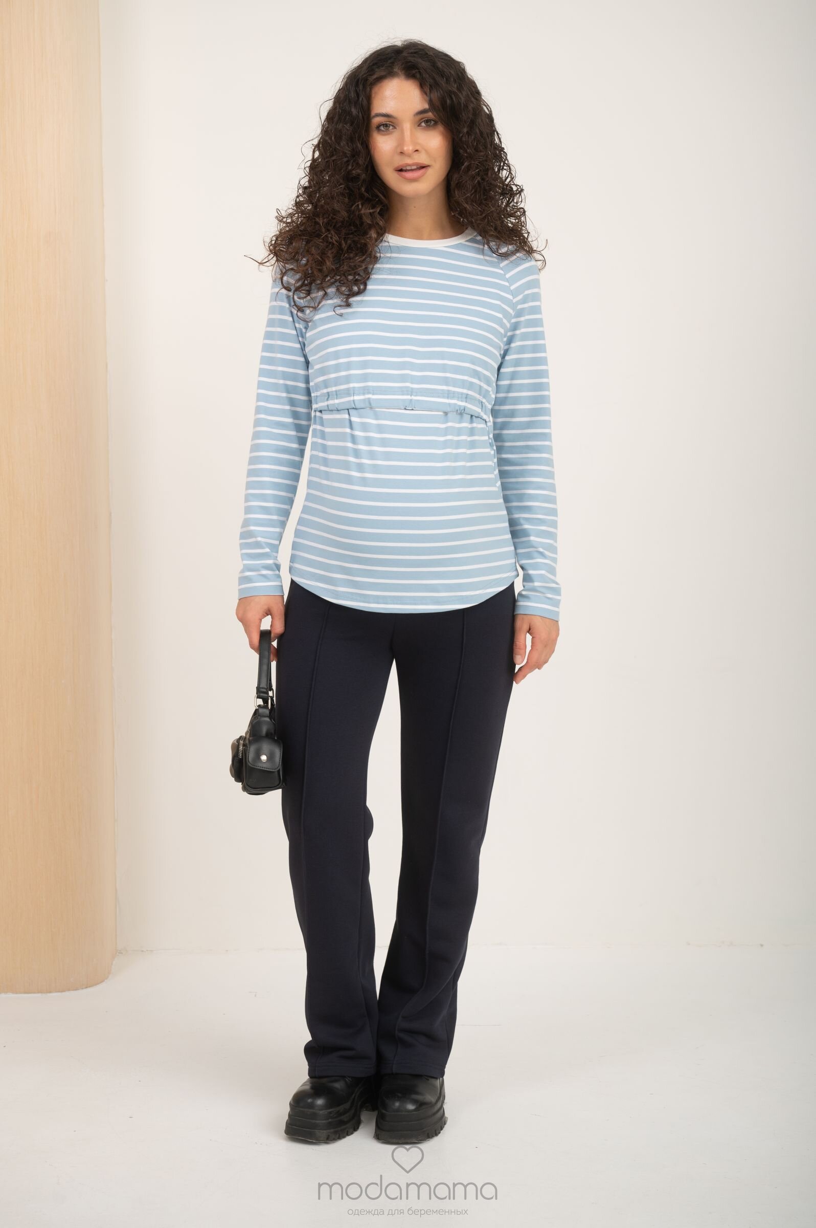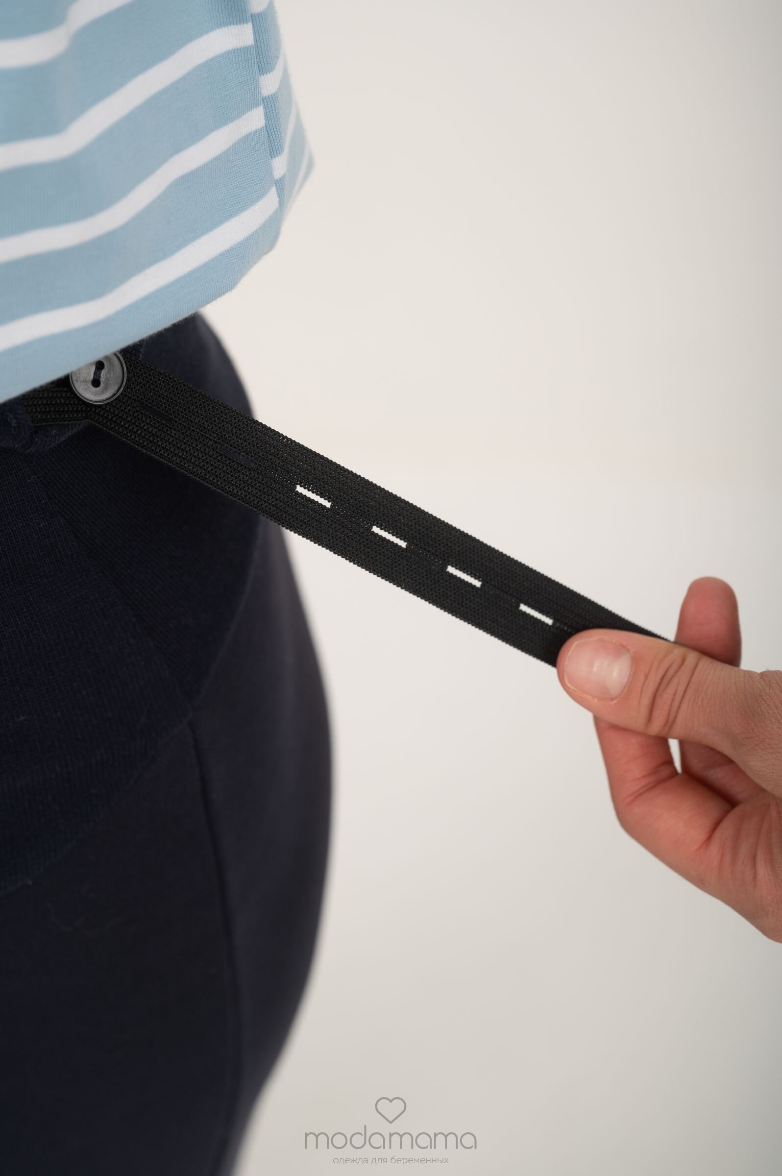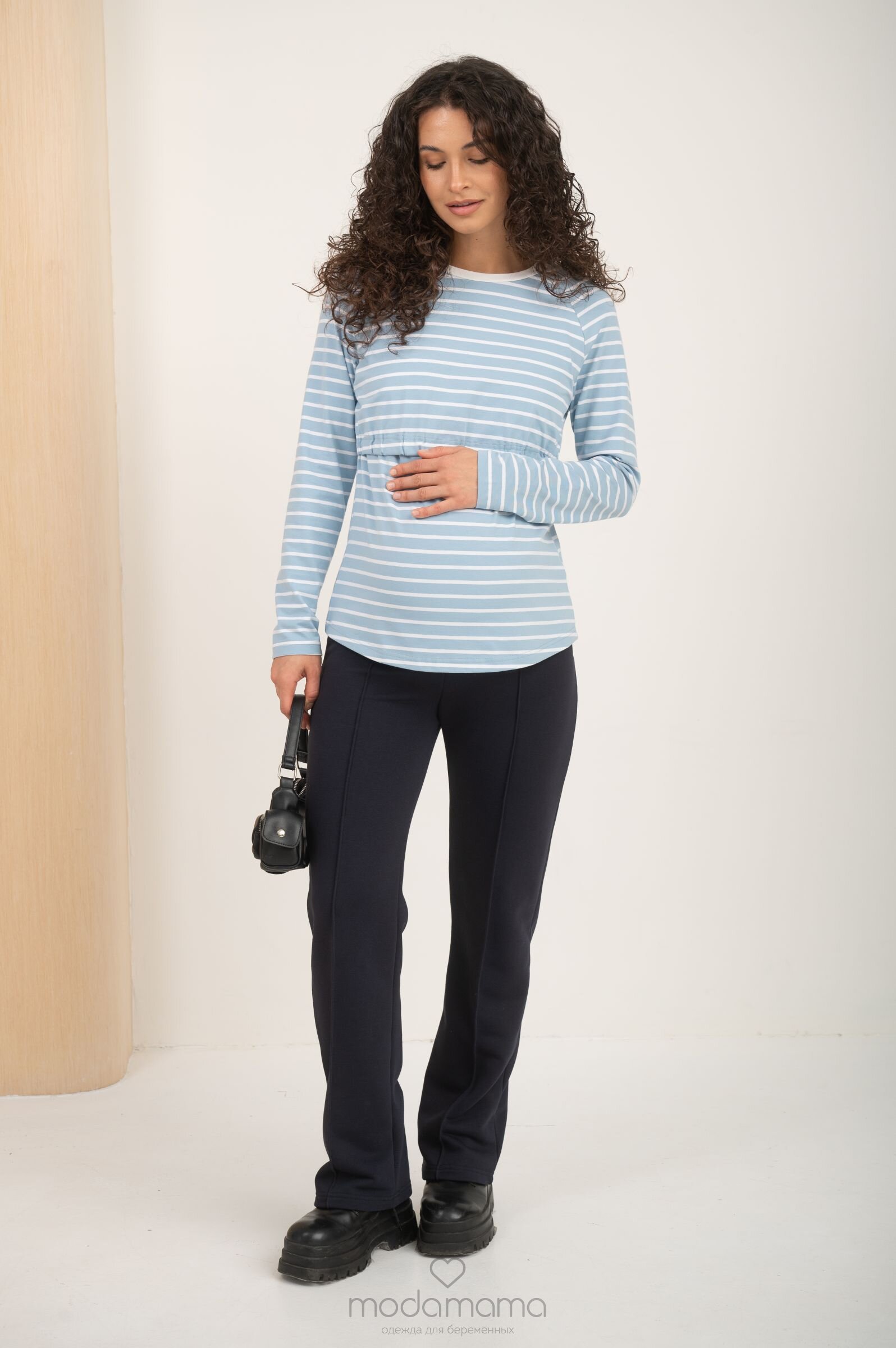 Брюки для беременных прямого кроя с отстроченными вертикальными стрелками. Высокий круговой трикотажный бандаж регулируется пуговкой по верху. Выполнены из мягкого, тянущегося трикотажа (футер-трёхнитка).