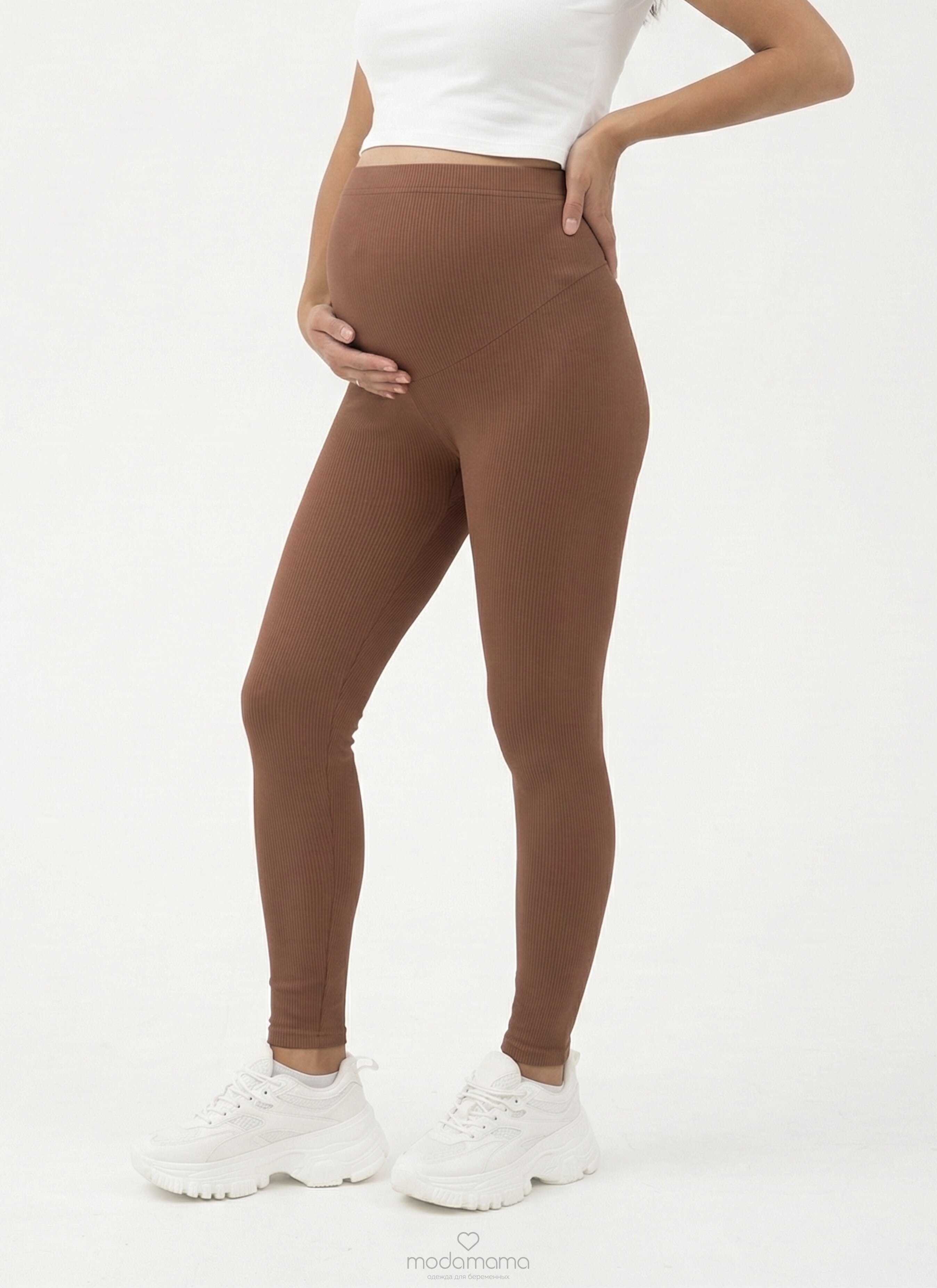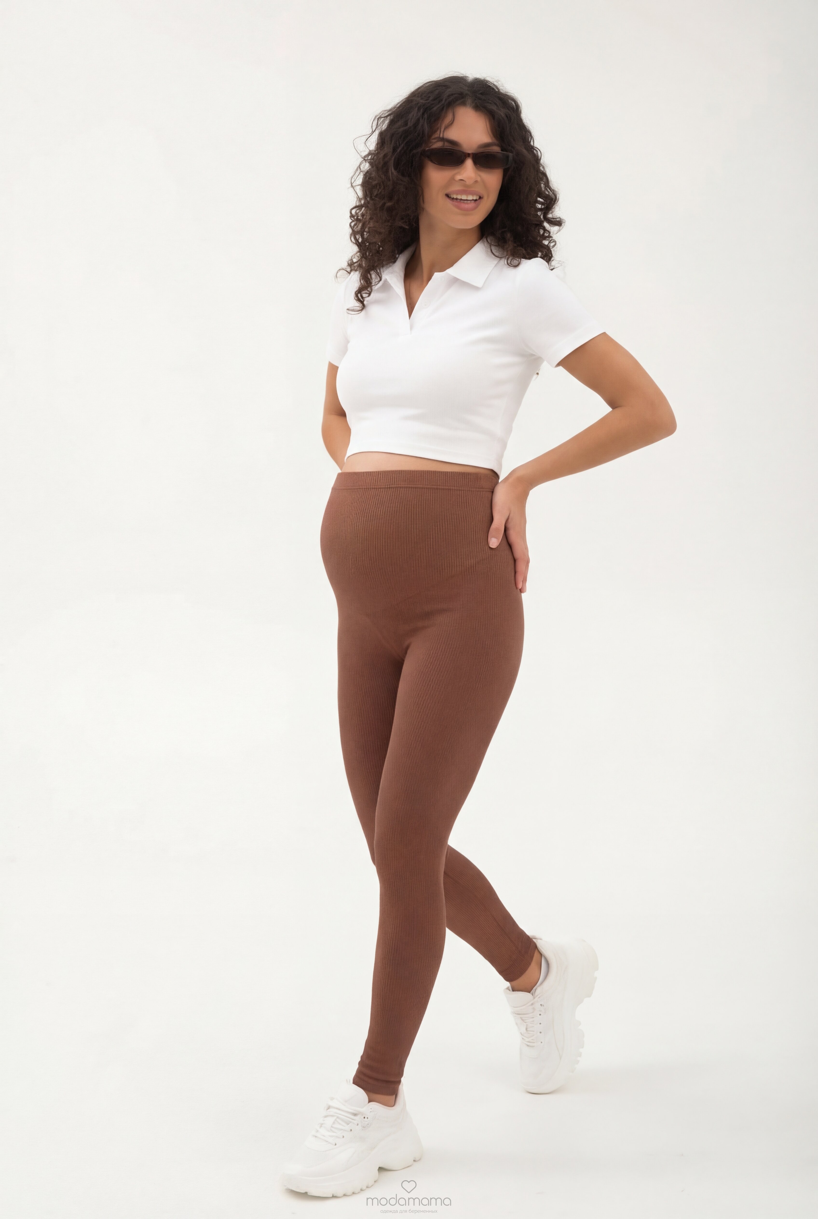 Леггинсы для беременных из тонкого, эластичного трикотажа-"лапша" с узким рубчиком. Хорошо держат форму. Высокий круговой трикотажный бандаж из основной ткани регулируется пуговкой сверху.