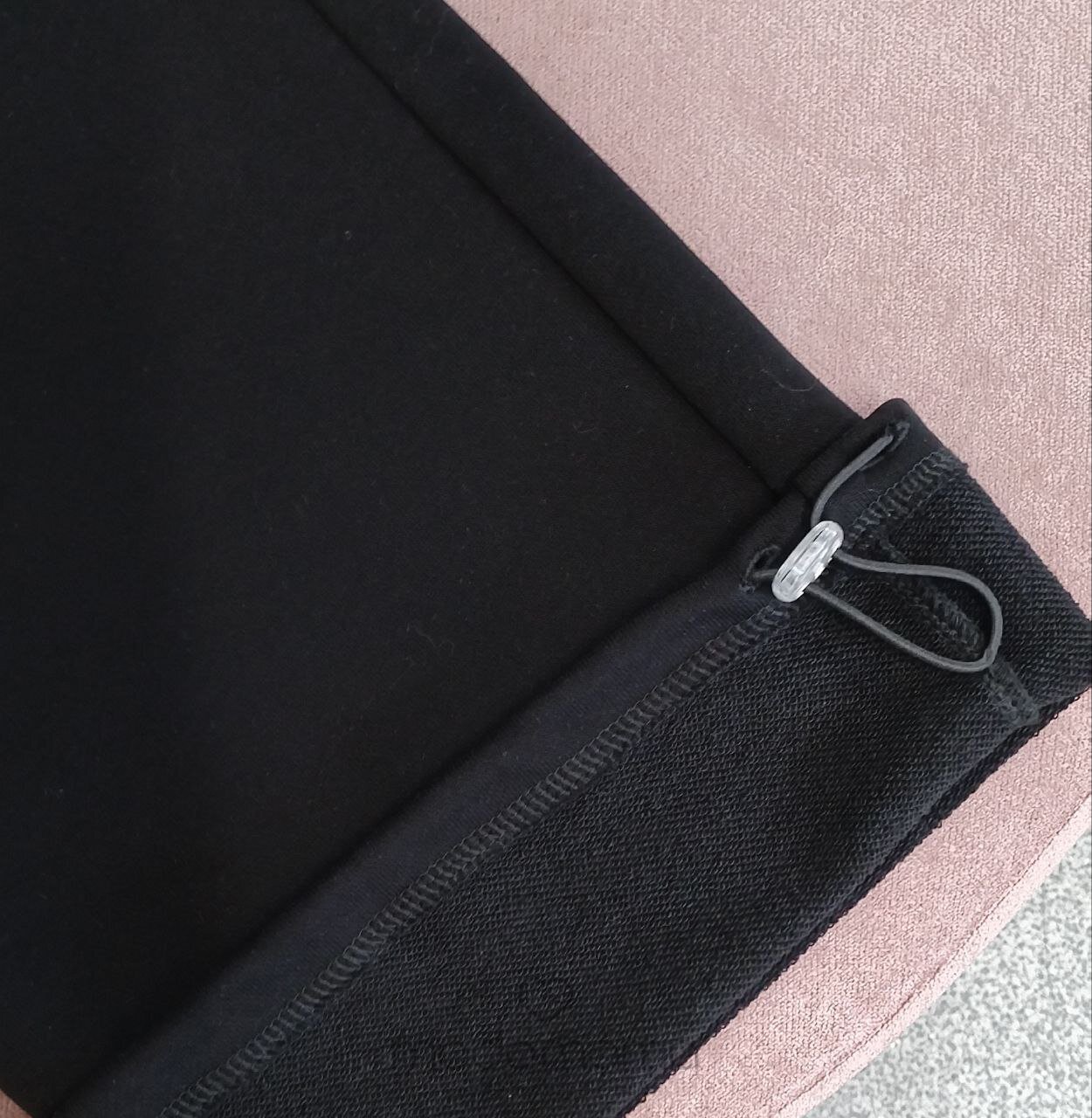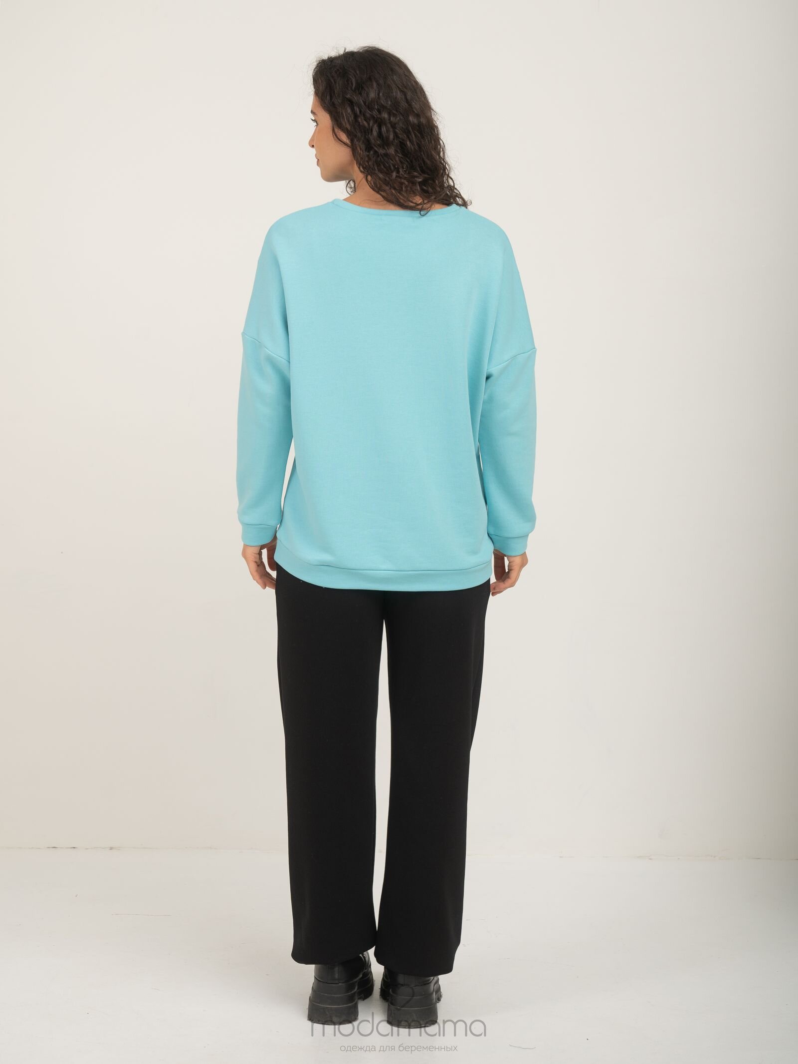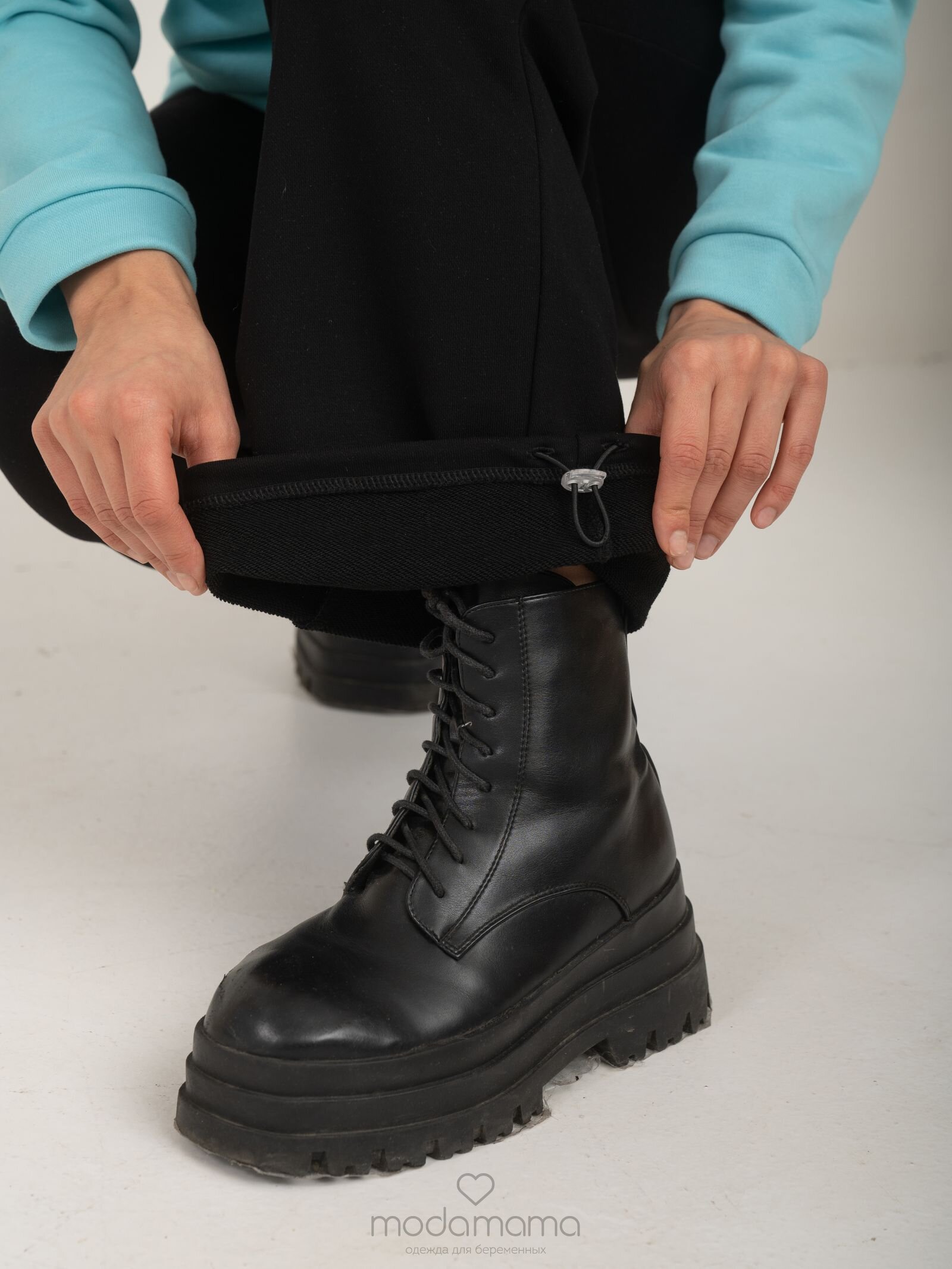 Стильные брюки широкого кроя с карманами в боковых швах и резинкой-утяжкой со стопперами по низу для беременных. Высокий круговой трикотажный бандаж регулируется пуговкой по верху. Выполнены из мягкого тянущегося трикотажа (футер-трёхнитка).