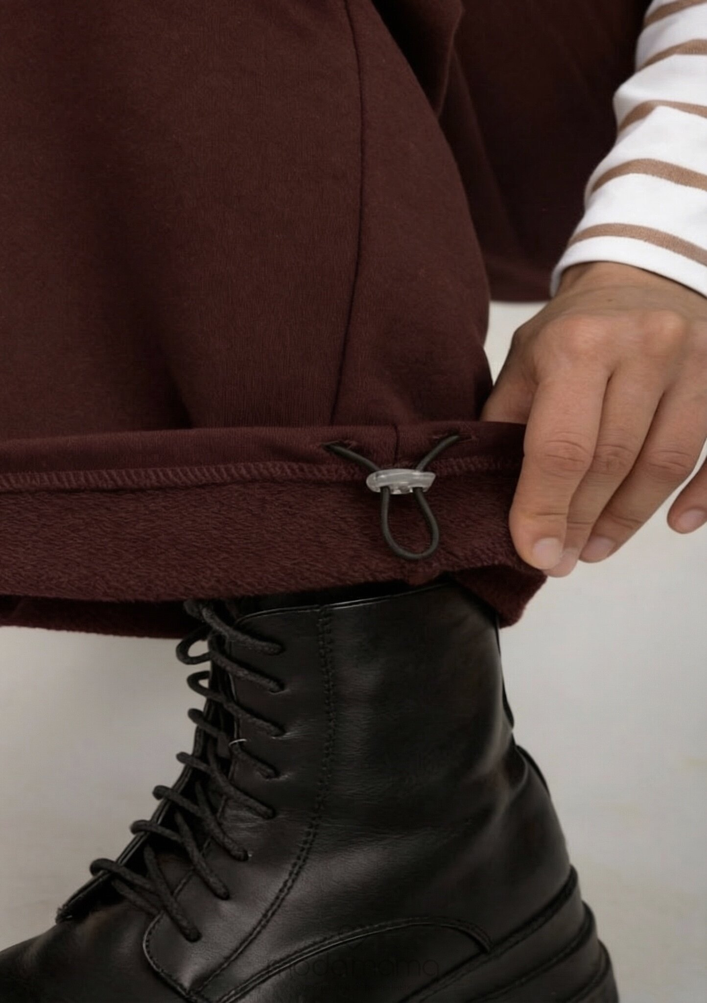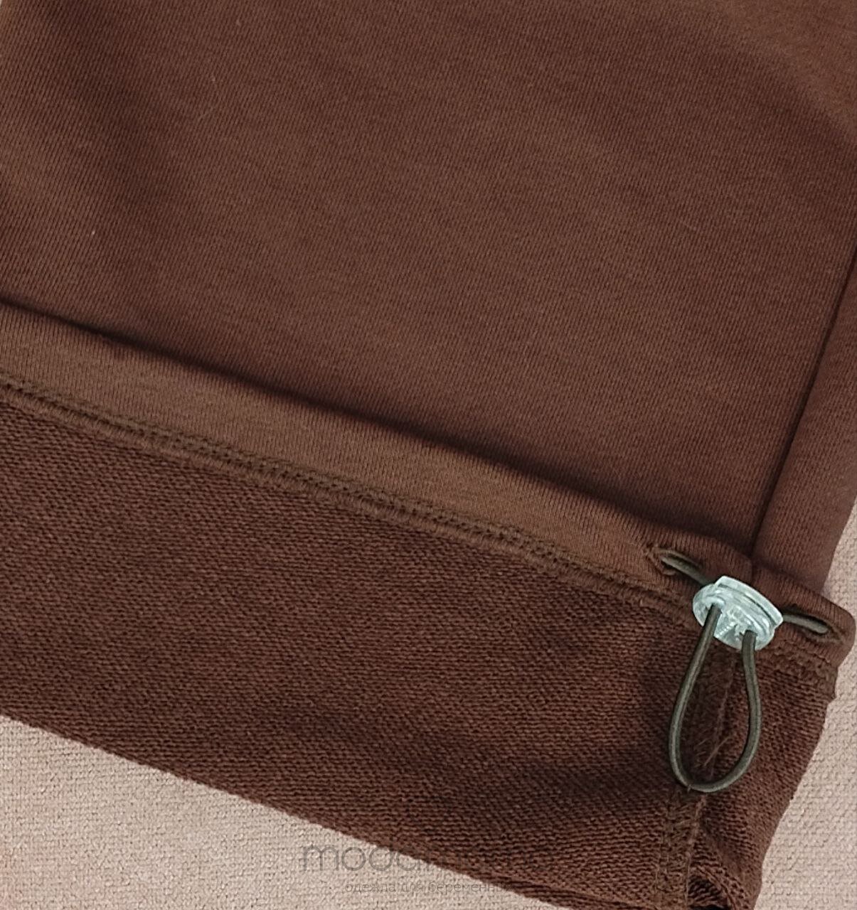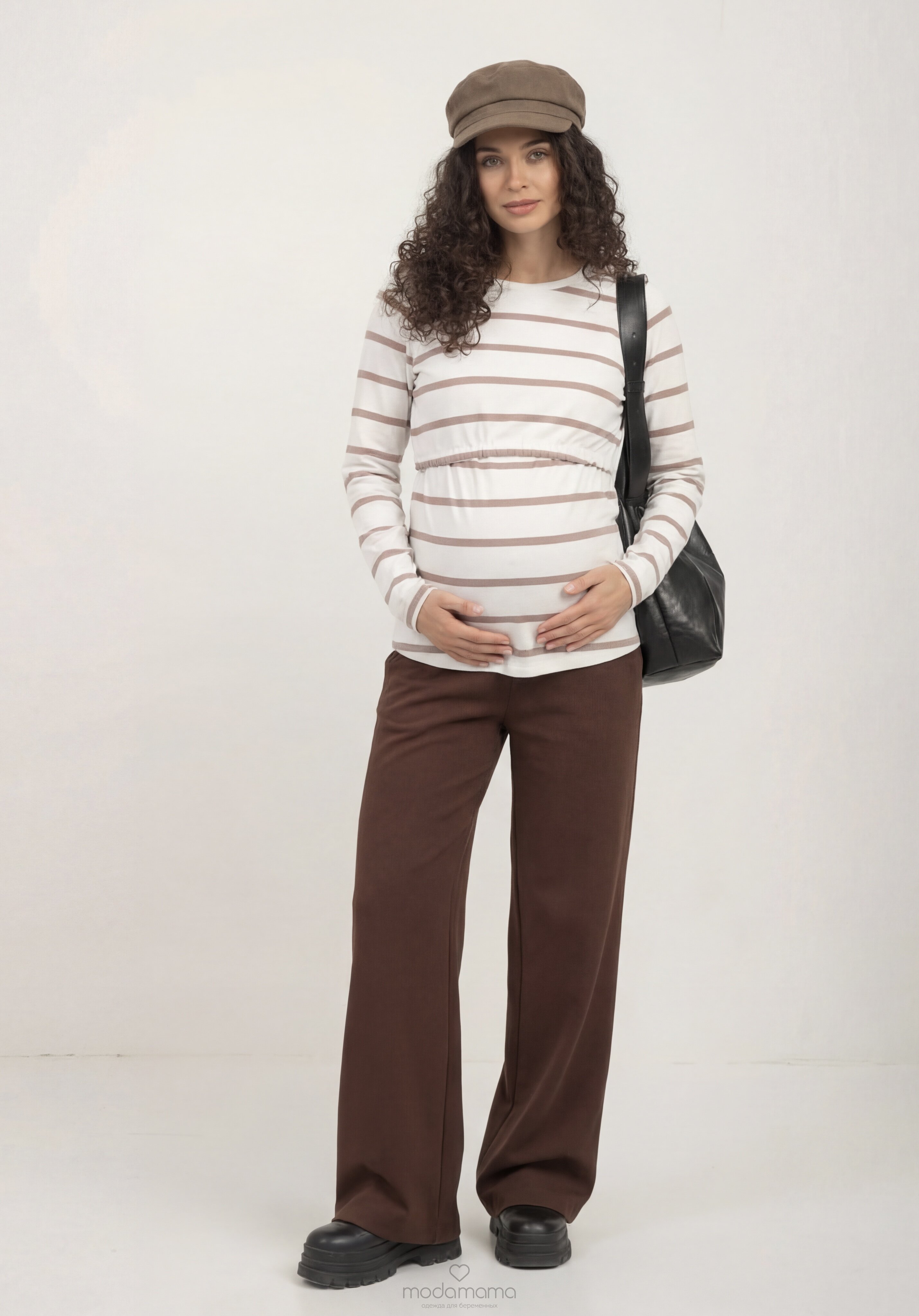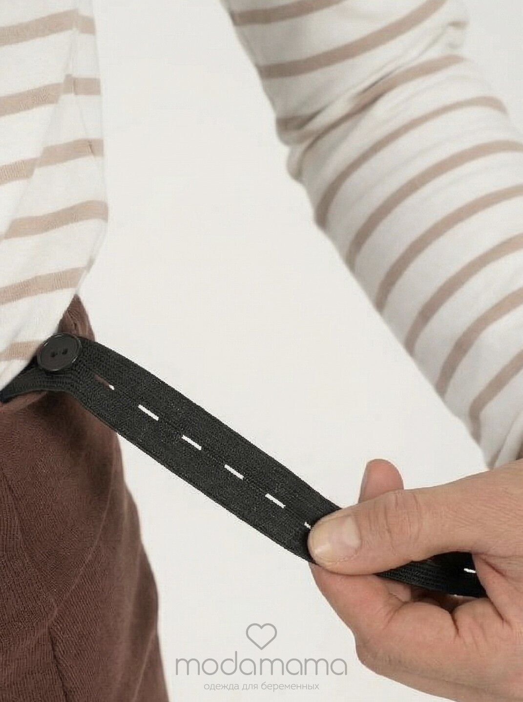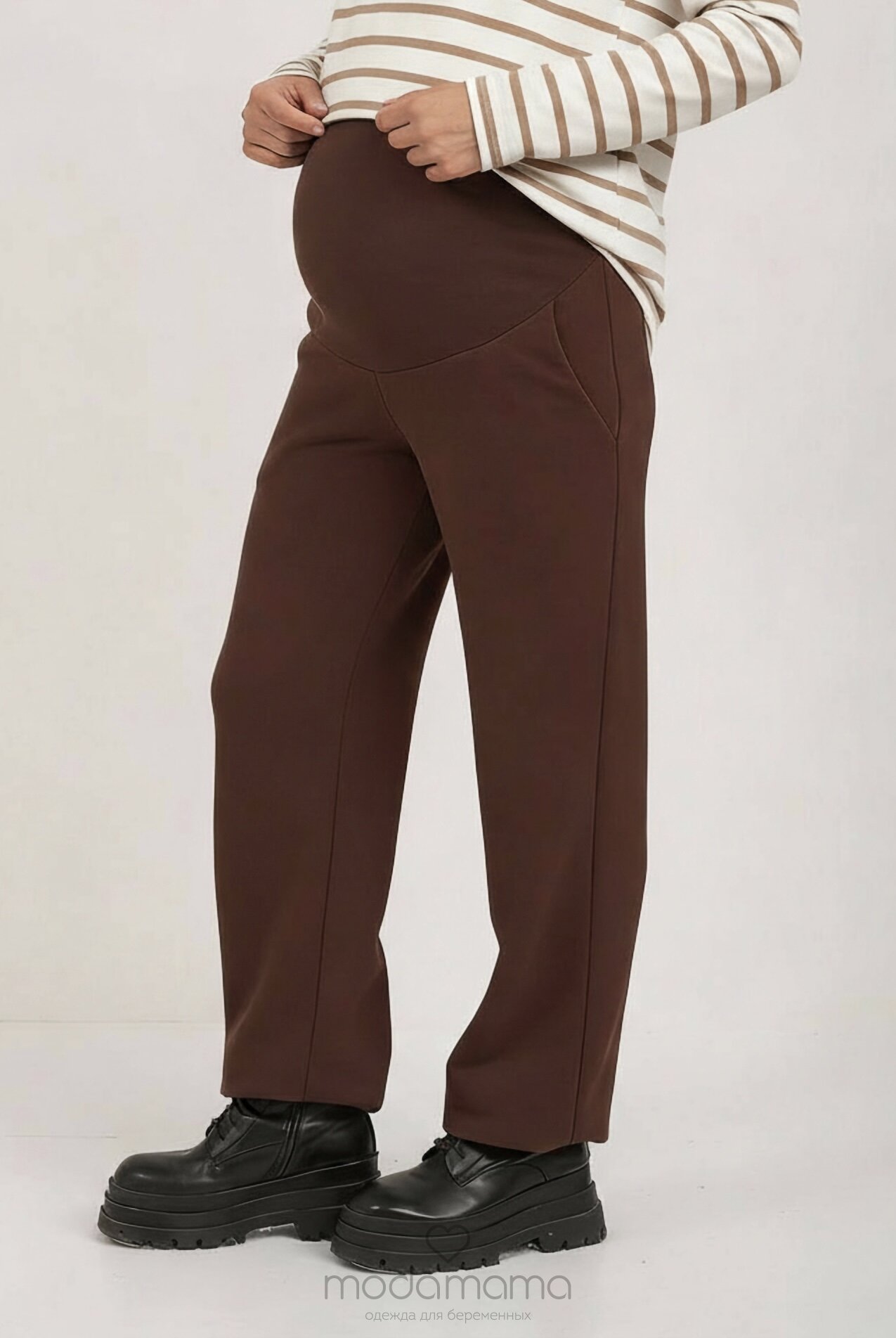 Стильные брюки широкого кроя с карманами в боковых швах и резинкой-утяжкой со стопперами по низу для беременных. Высокий круговой трикотажный бандаж регулируется пуговкой по верху. Выполнены из мягкого тянущегося трикотажа (футер-трёхнитка).