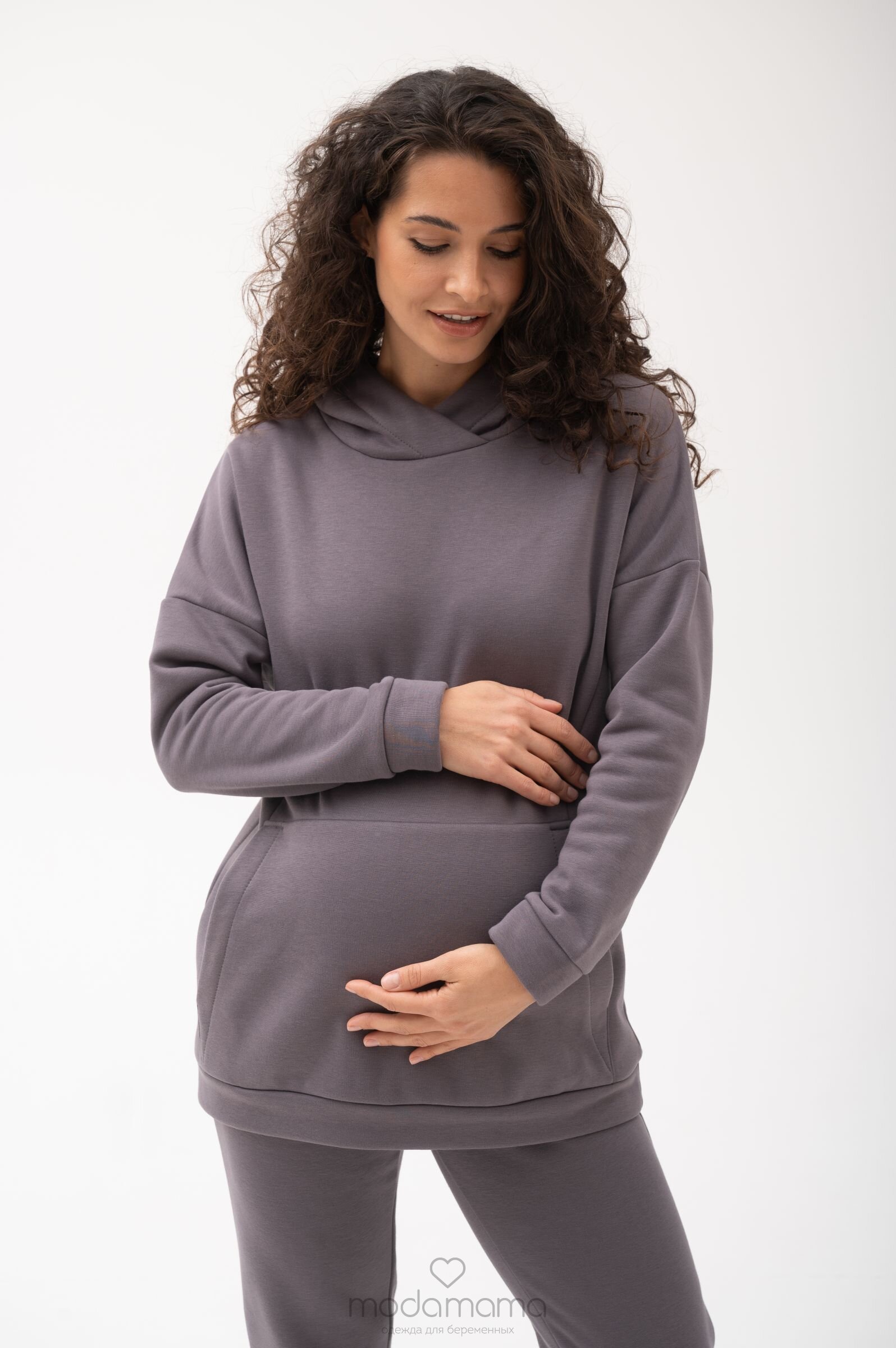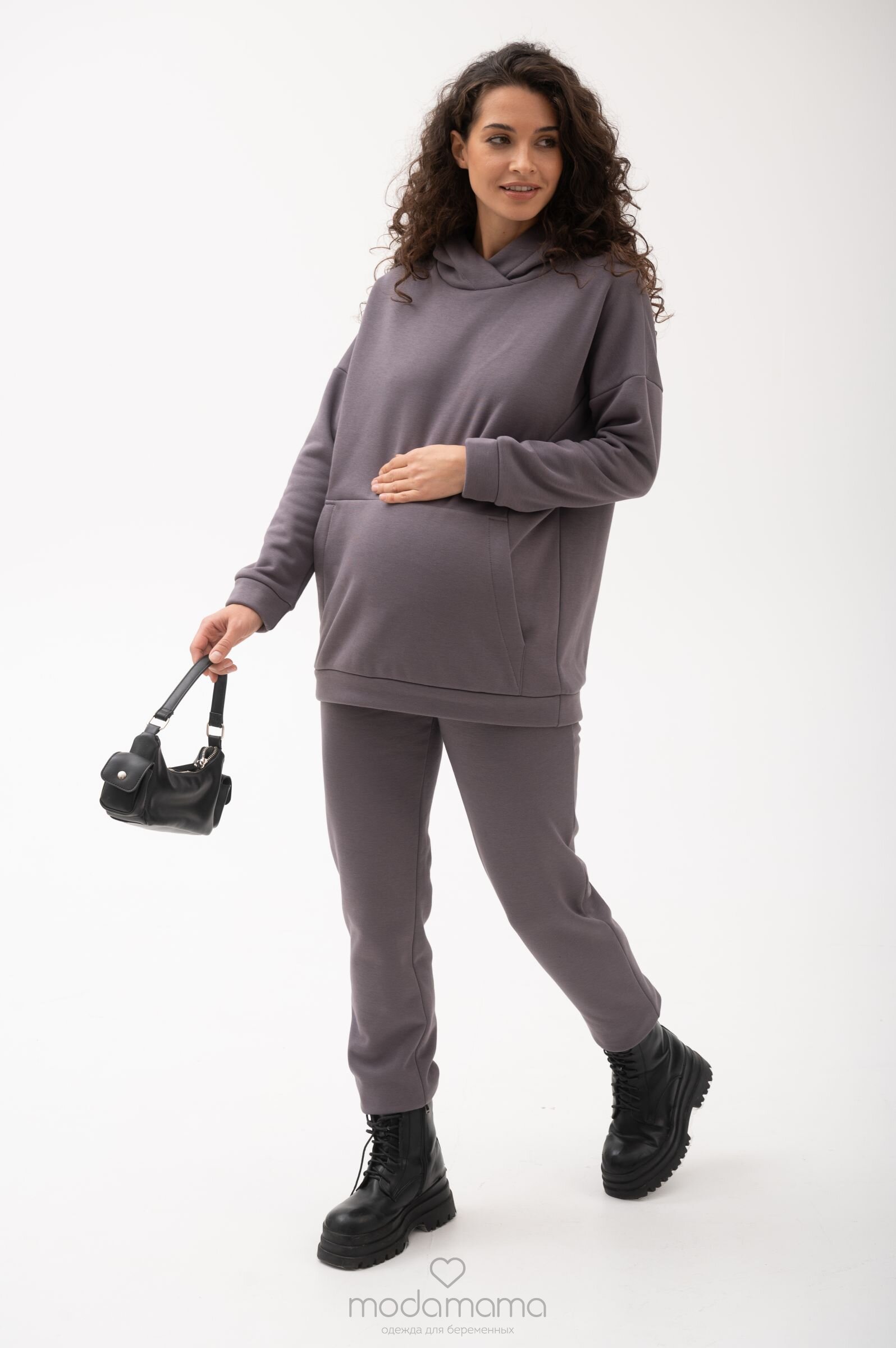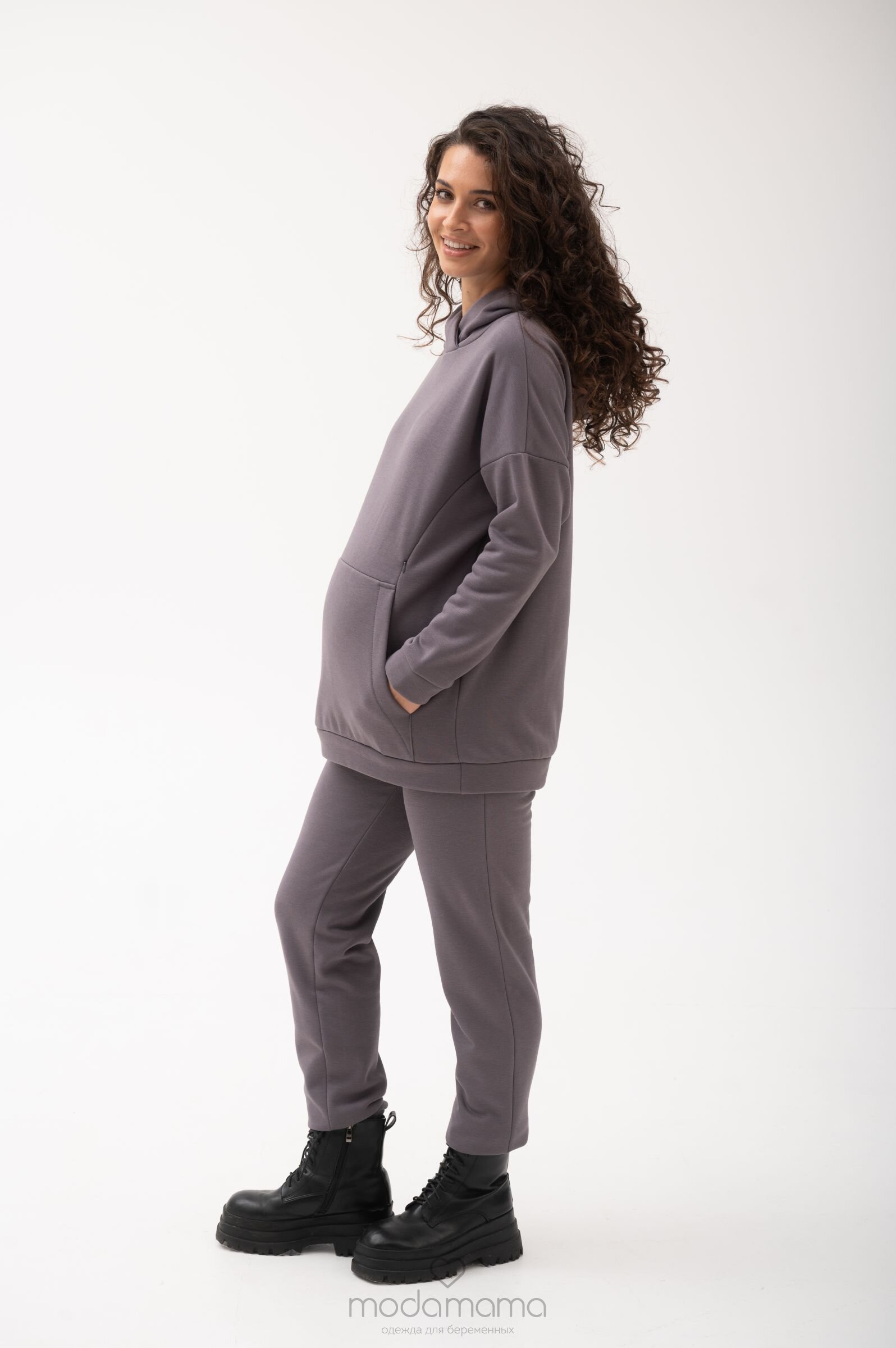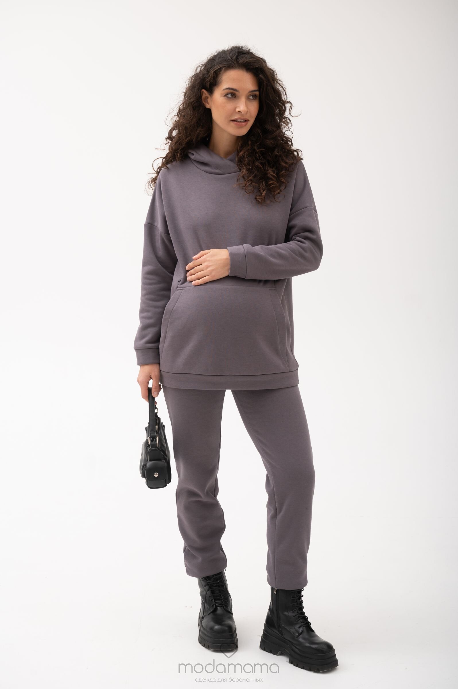 Утеплённый спортивный костюм для беременных и кормящих мам. Худи свободного кроя со спущенным рукавом и карманом-"кенгуру". Секрет для кормления-вертикальные замки-"молнии" в рельефах на груди. Брюки свободного кроя с резинкой по низу,высокий трикотажный бандаж регулируется пуговкой по верху. Костюм выполнен из мягкого, утепленного, тянущегося трикотажа (футер 3-нитка с флисом-"барашек").