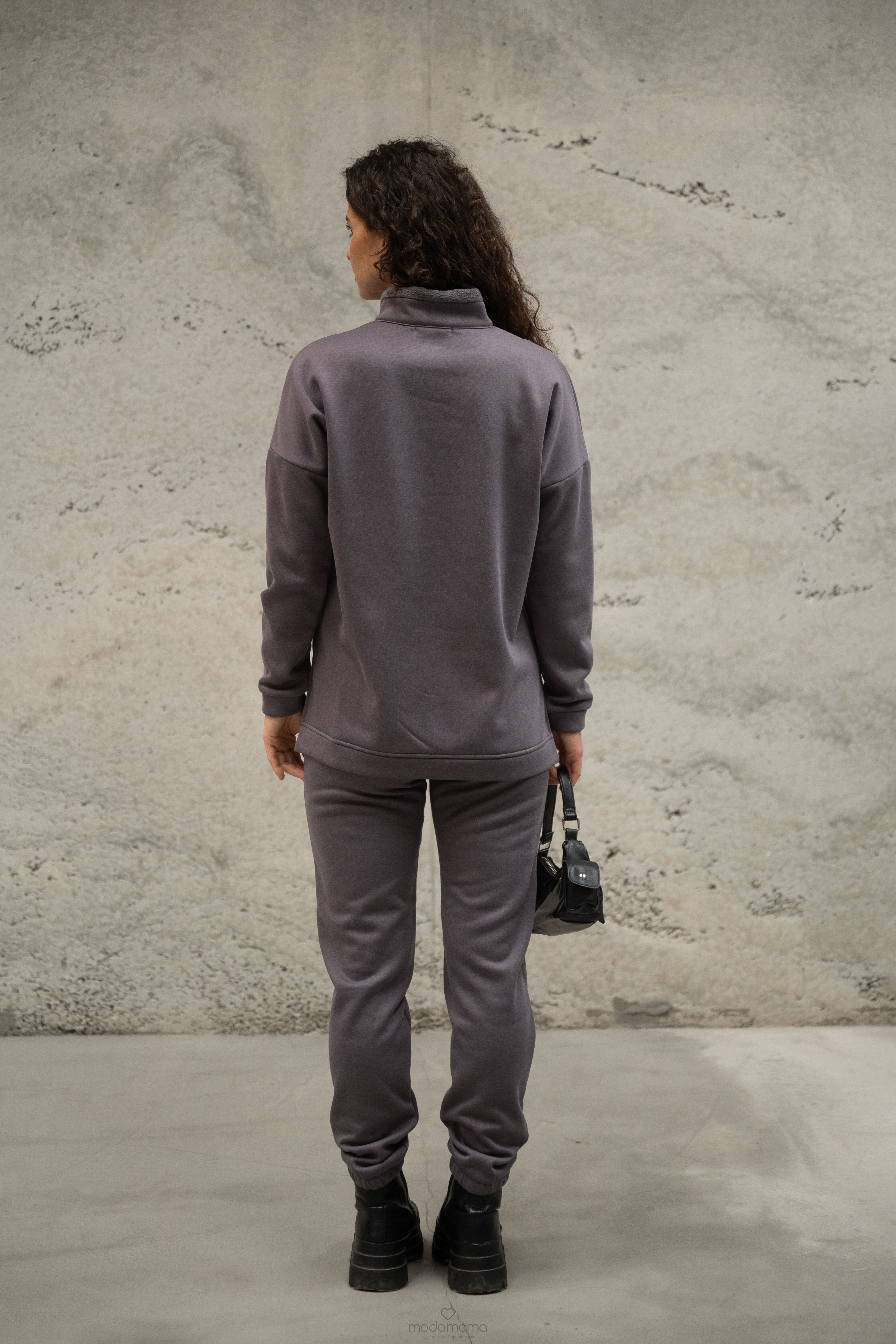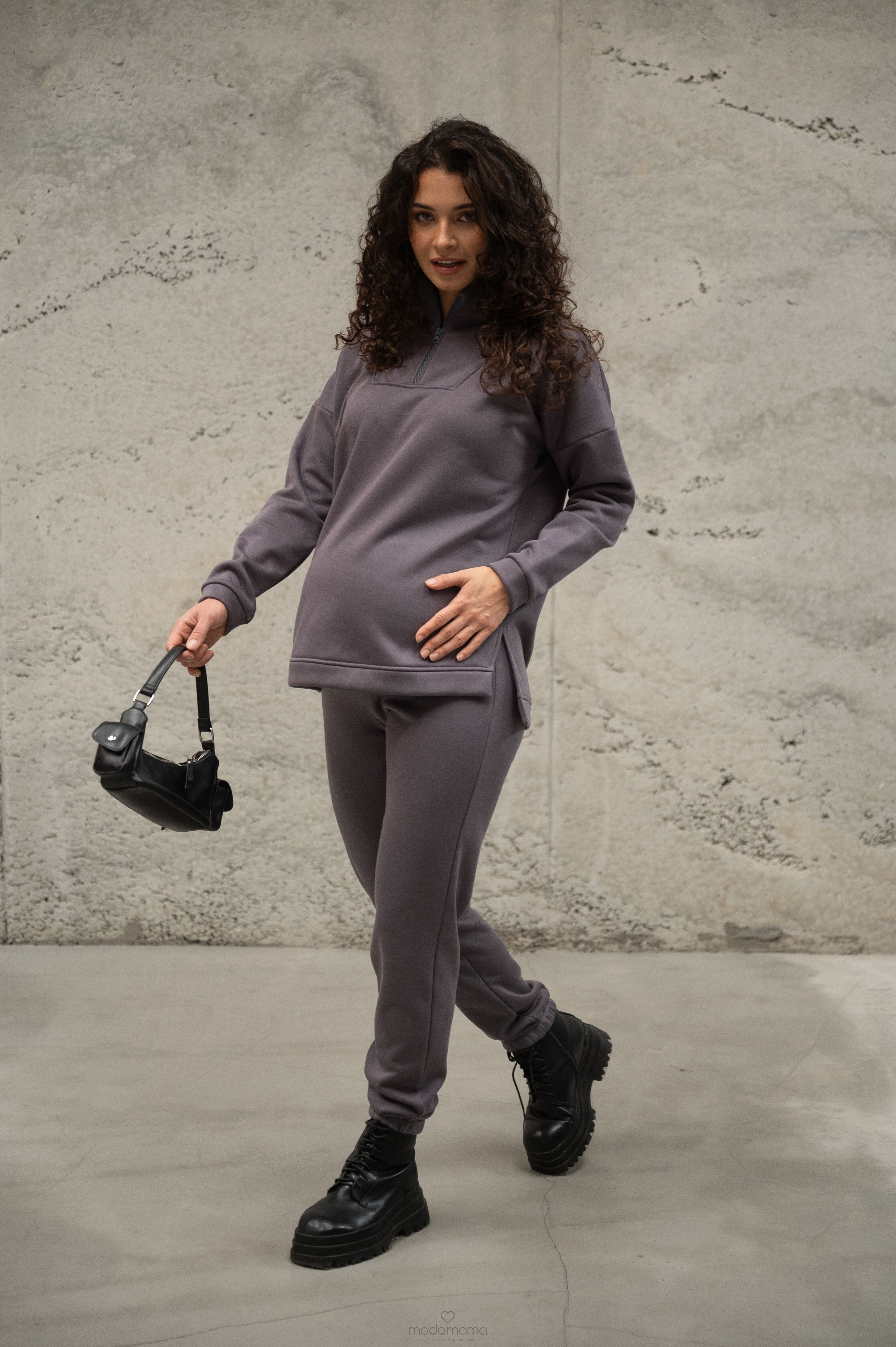 Утепленный спортивный костюм для беременных. Джемпер для беременных свободного силуэта со спущенным плечом, разноуровневым подолом с разрезами и воротником-стойкой на молнии, Спортивные брюки для беременных с резинкой по низу. Высокий круговой трикотажный бандаж регулируется пуговкой по верху. Выполнен из мягкого, утепленного, тянущегося трикотажа (футер 3-нитка с флисом-"барашек").