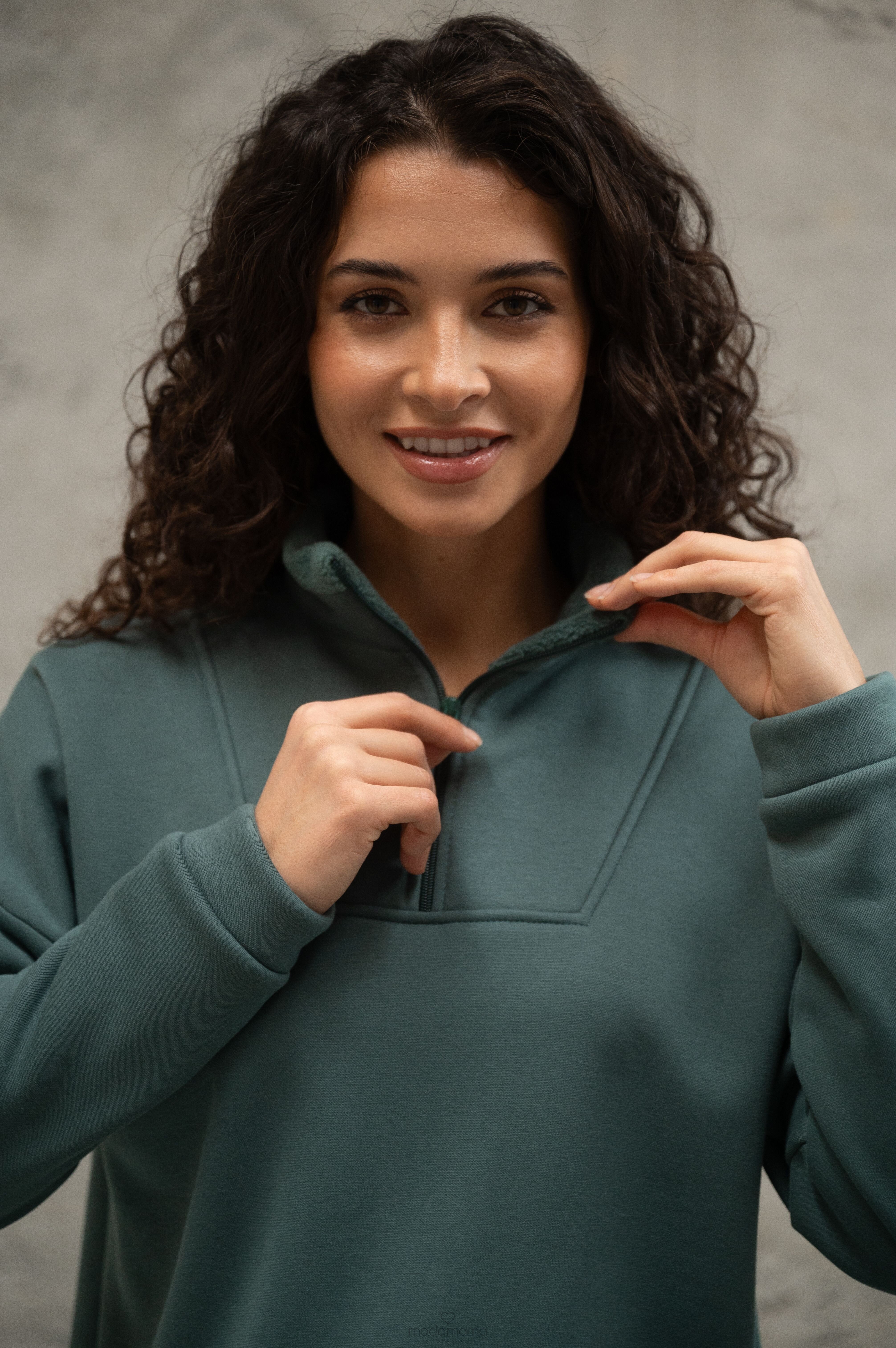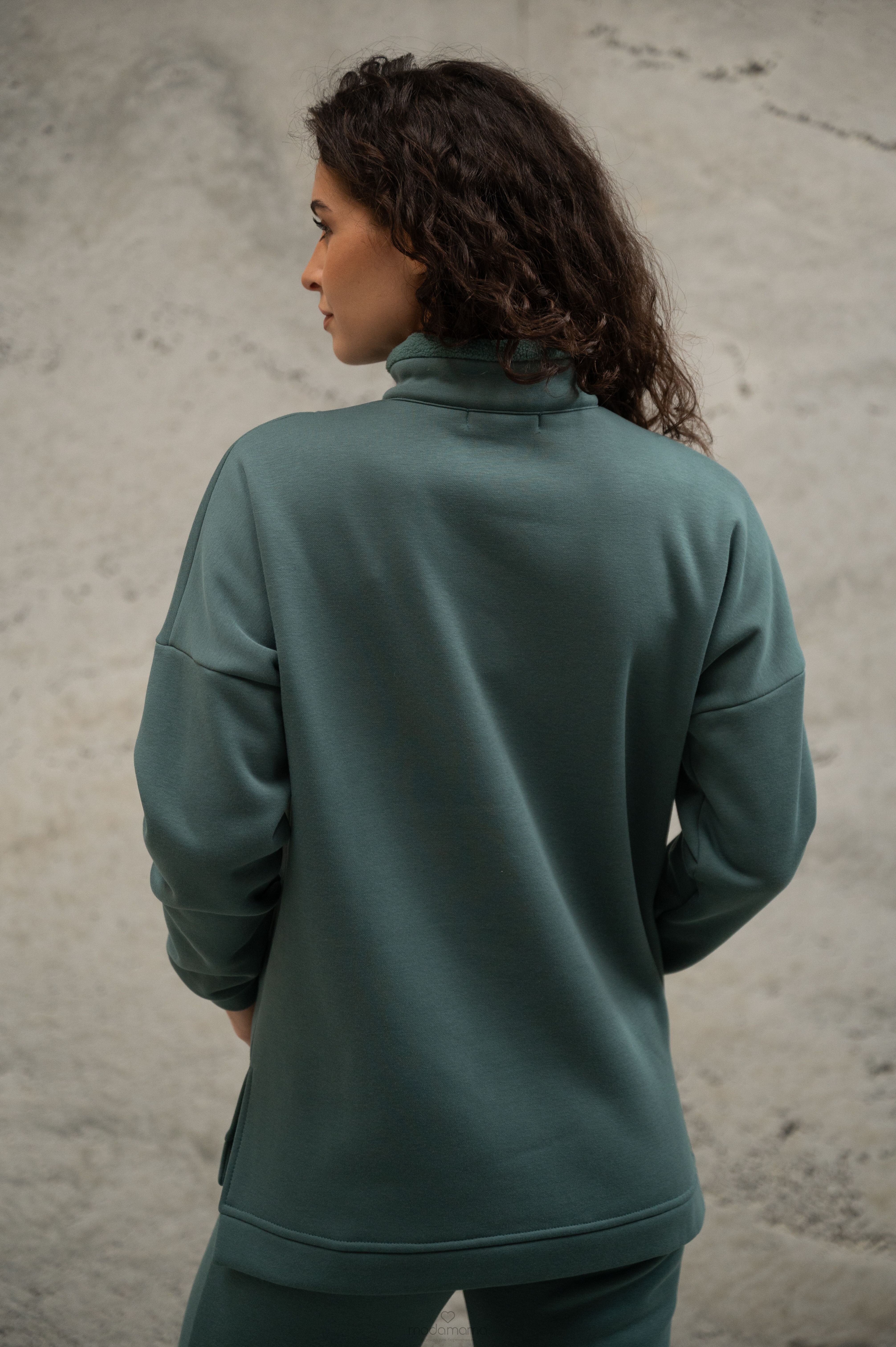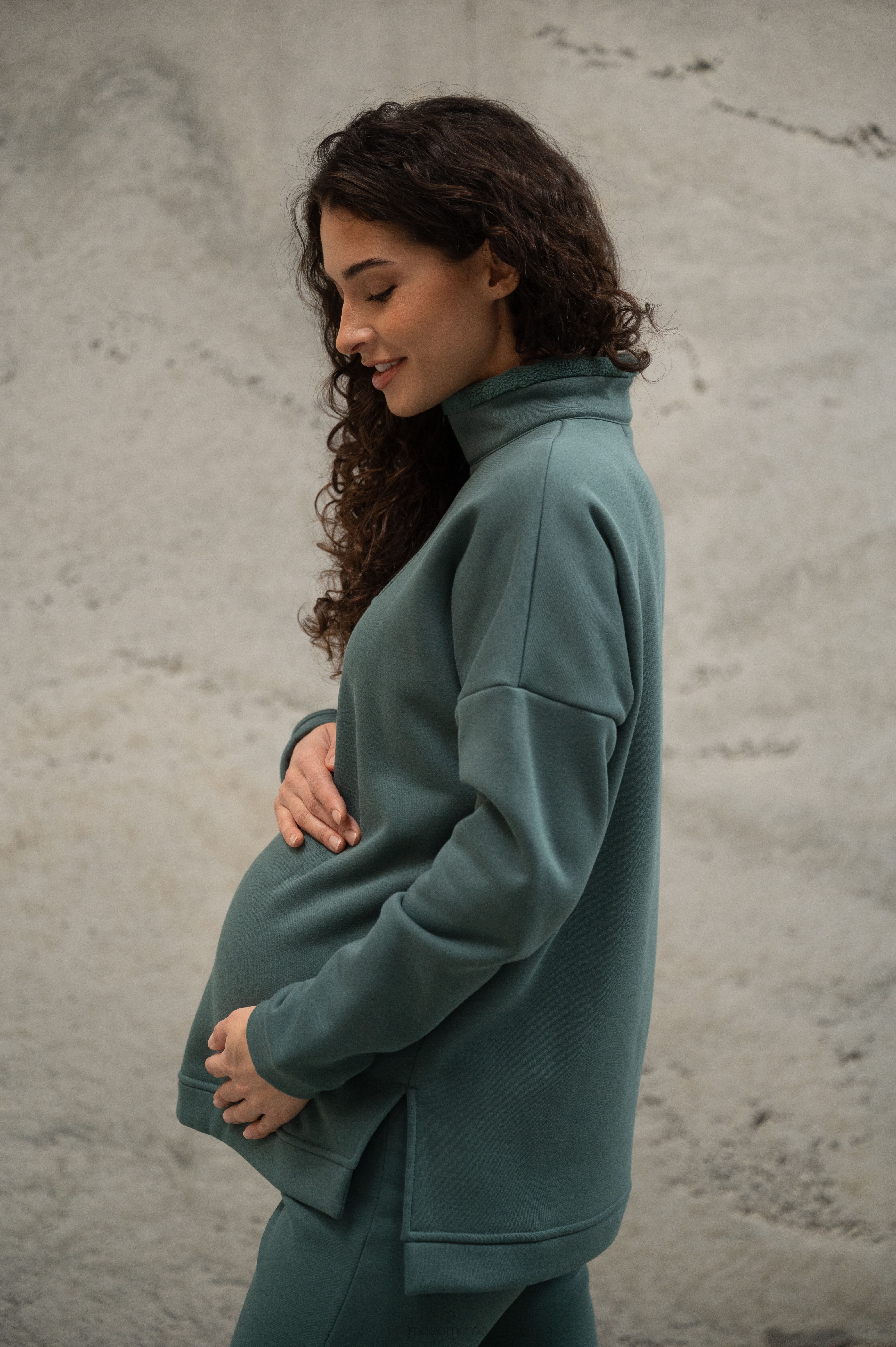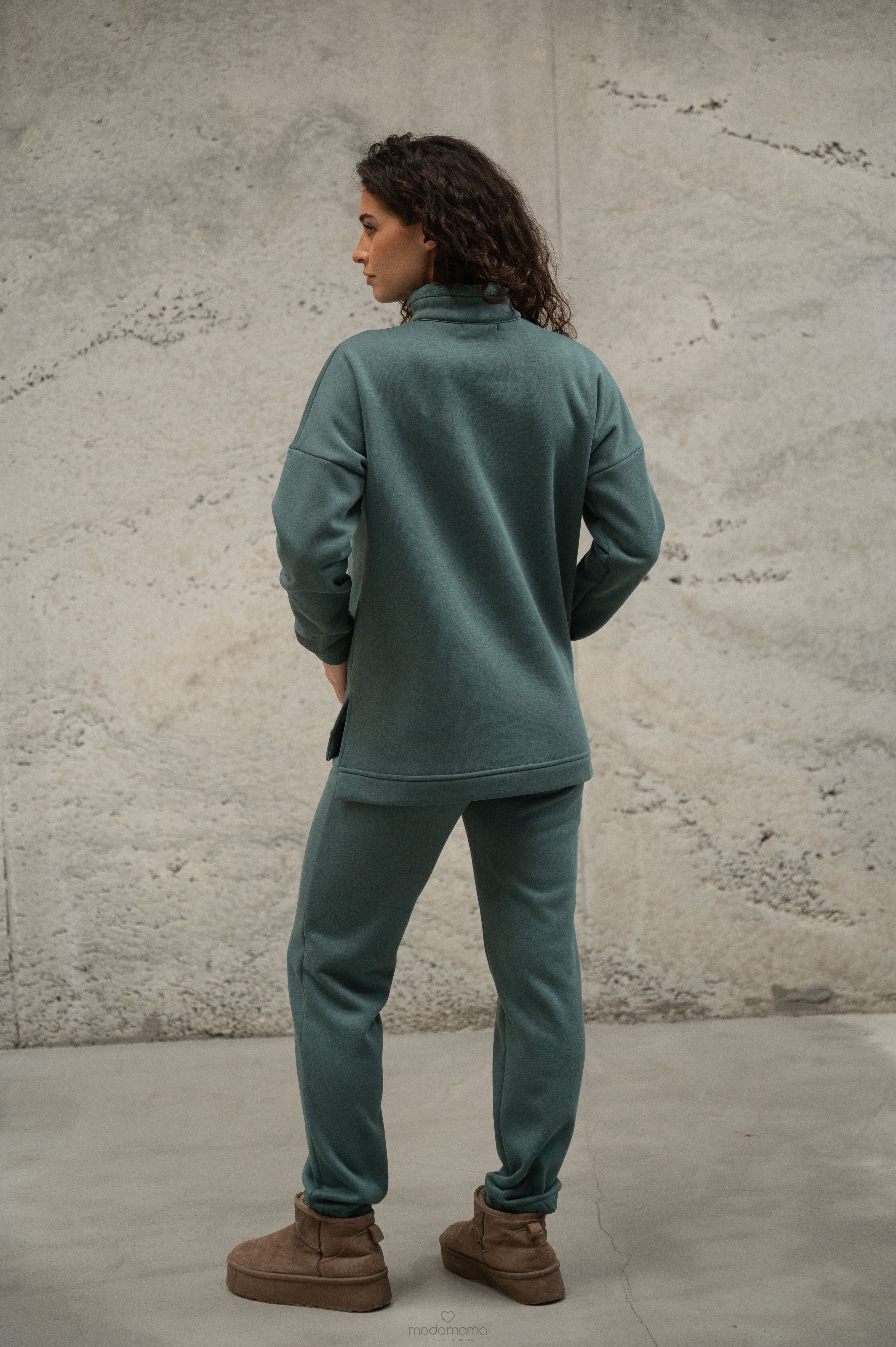 Утепленный спортивный костюм для беременных. Джемпер для беременных свободного силуэта со спущенным плечом, разноуровневым подолом с разрезами и воротником-стойкой на молнии, Спортивные брюки для беременных с резинкой по низу. Высокий круговой трикотажный бандаж регулируется пуговкой по верху. Выполнен из мягкого, утепленного, тянущегося трикотажа (футер 3-нитка с флисом-"барашек").
