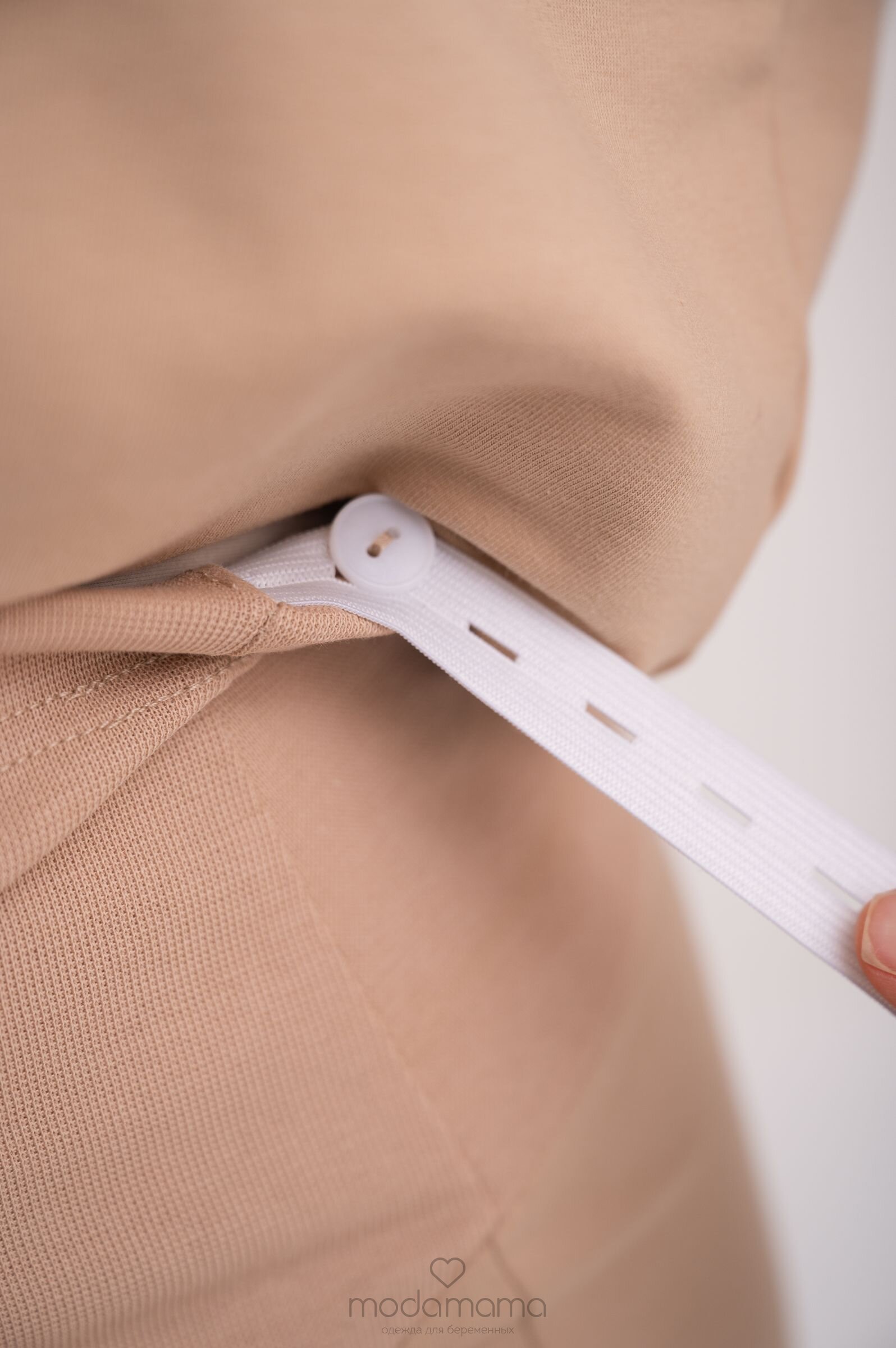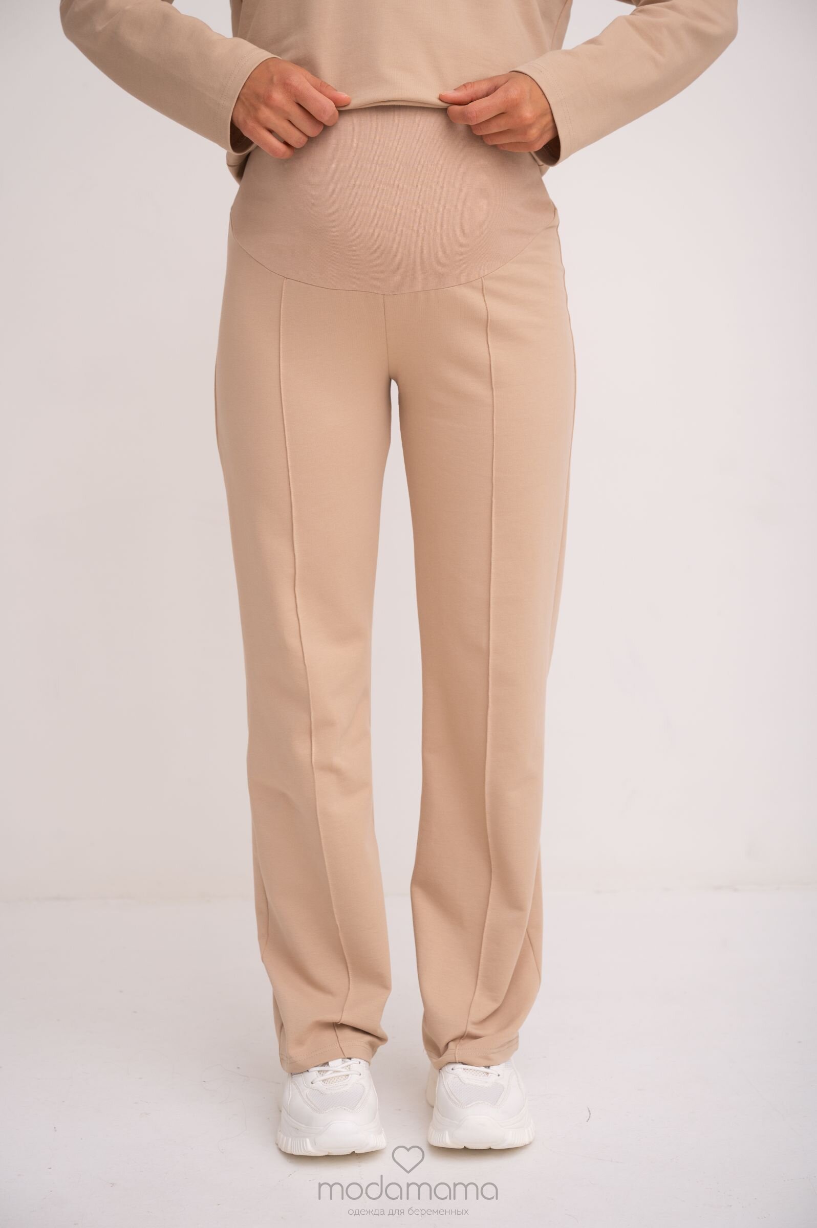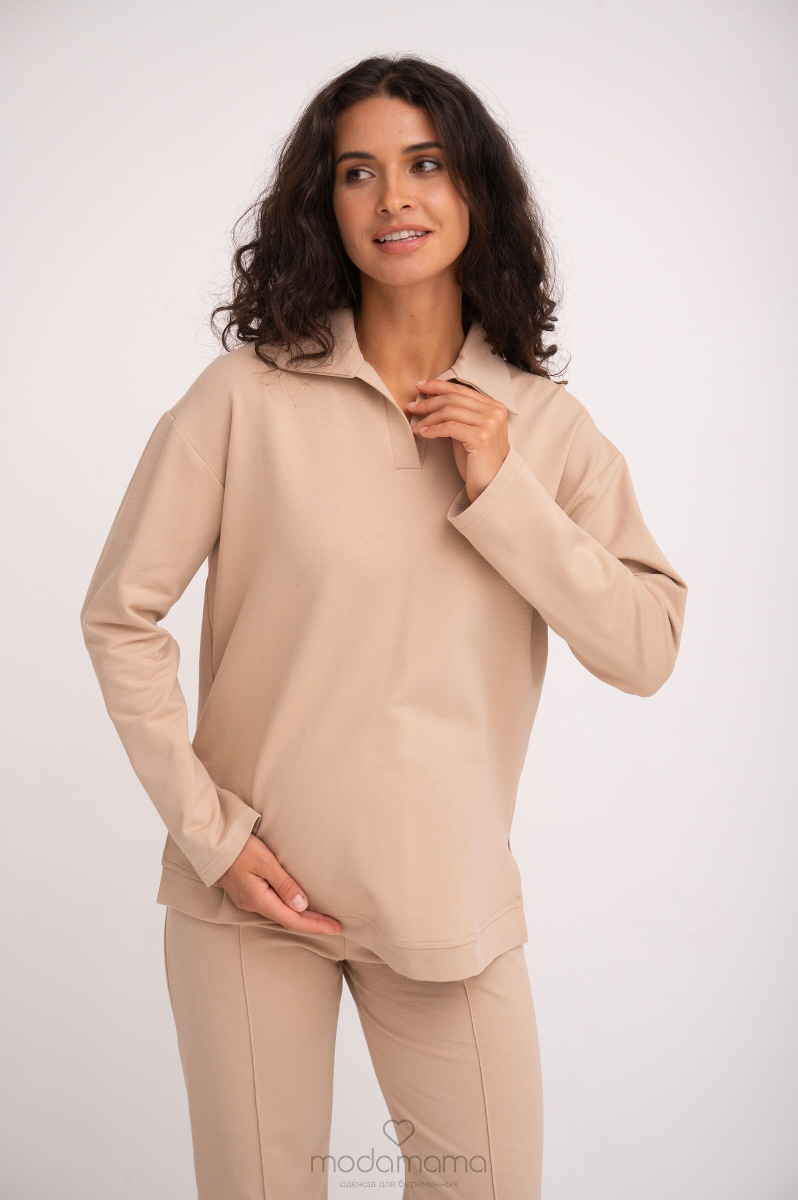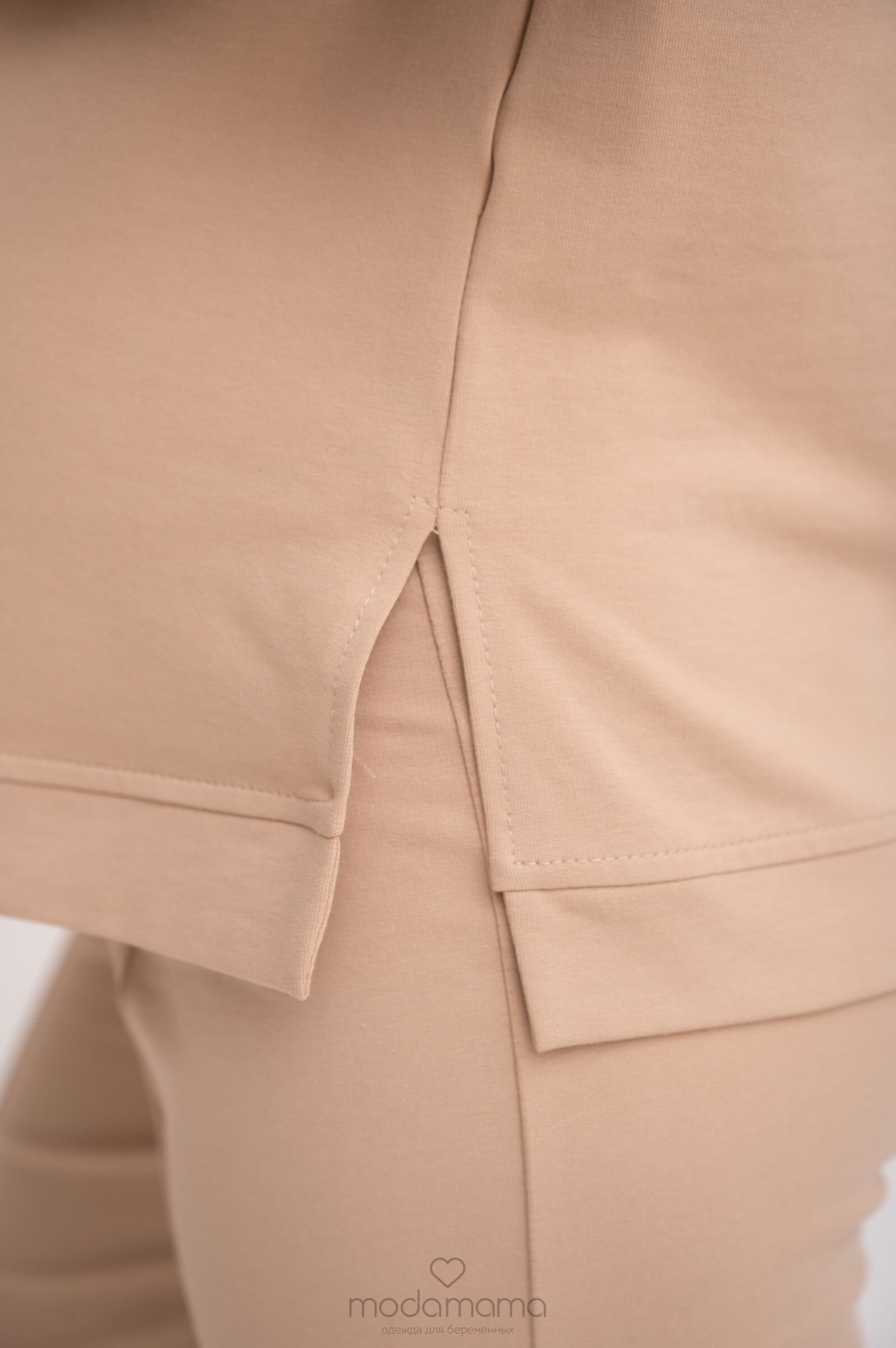 Костюм для беременных из мягкого, тянущегося трикотажа (футер двухнитка). Джемпер свободного силуэта с V-образным вырезом и воротником-поло. Брюки для беременных прямого кроя с отстроченными вертикальными стрелками.